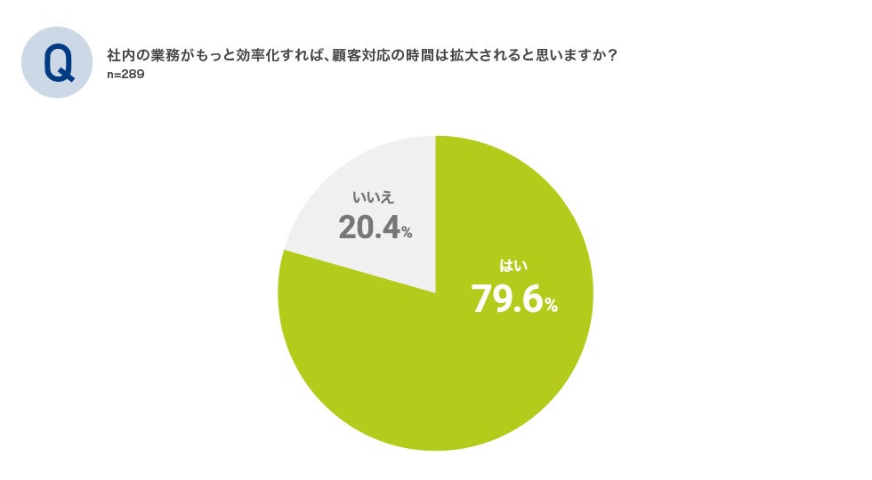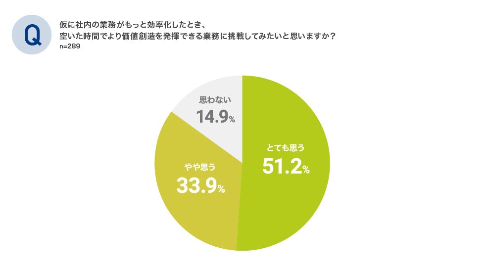 「社内の業務がもっと効率化すれば、顧客対応の時間は拡大されると思いますか?」の問いに「はい」と回答した人は79.6%で、「仮に社内の業務がもっと効率化したとき、空いた時間でより価値創造を発揮できる業務に挑戦してみたいと思いますか?」に「とても思う」「やや思う」と回答した人の合計は85.1%。
