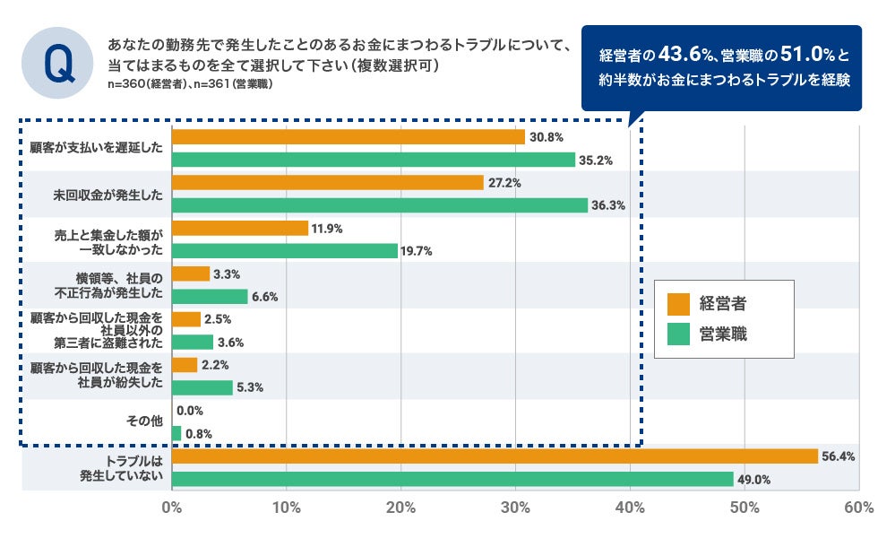 「お金にまつわるトラブルは発生していない」と回答した人は経営者が56.4%、営業職が49.0%で、残り43.6%の経営者、51.0%の営業職が何らかのお金にまつわるトラブルを経験したことがあるという結果に。代表的なトラブルとしては、経営者、営業職ともに「顧客の支払い遅延」、「未回収金の発生」、「売上と入金額の不一致」が上位を占めた。