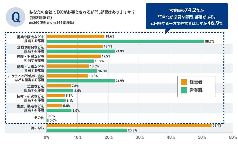 また、DXが必要とされる部門、部署は「特になし」と回答した営業職はわずか25.8%で残り74.2%がDXが必要な部門、部署を回答しているのに対し、同様の問いに「特になし」と回答した経営者は53.1%で残り46.9%がDXが必要な部門、部署を回答している。