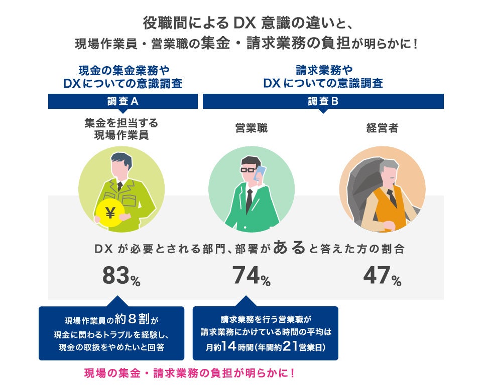 ①集金を担当する現場作業員の83%、営業職の74%が「DXが必要な部署がある」と回答する一方で経営者はわずか47%