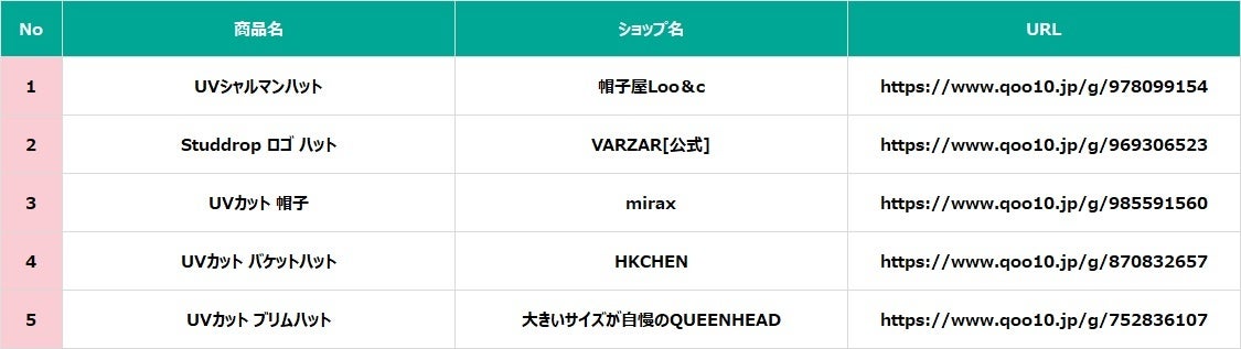 Qoo10(https://www.qoo10.jp/)サイト上、「ハット」カテゴリーの各販売個数に基づいたランキングです。