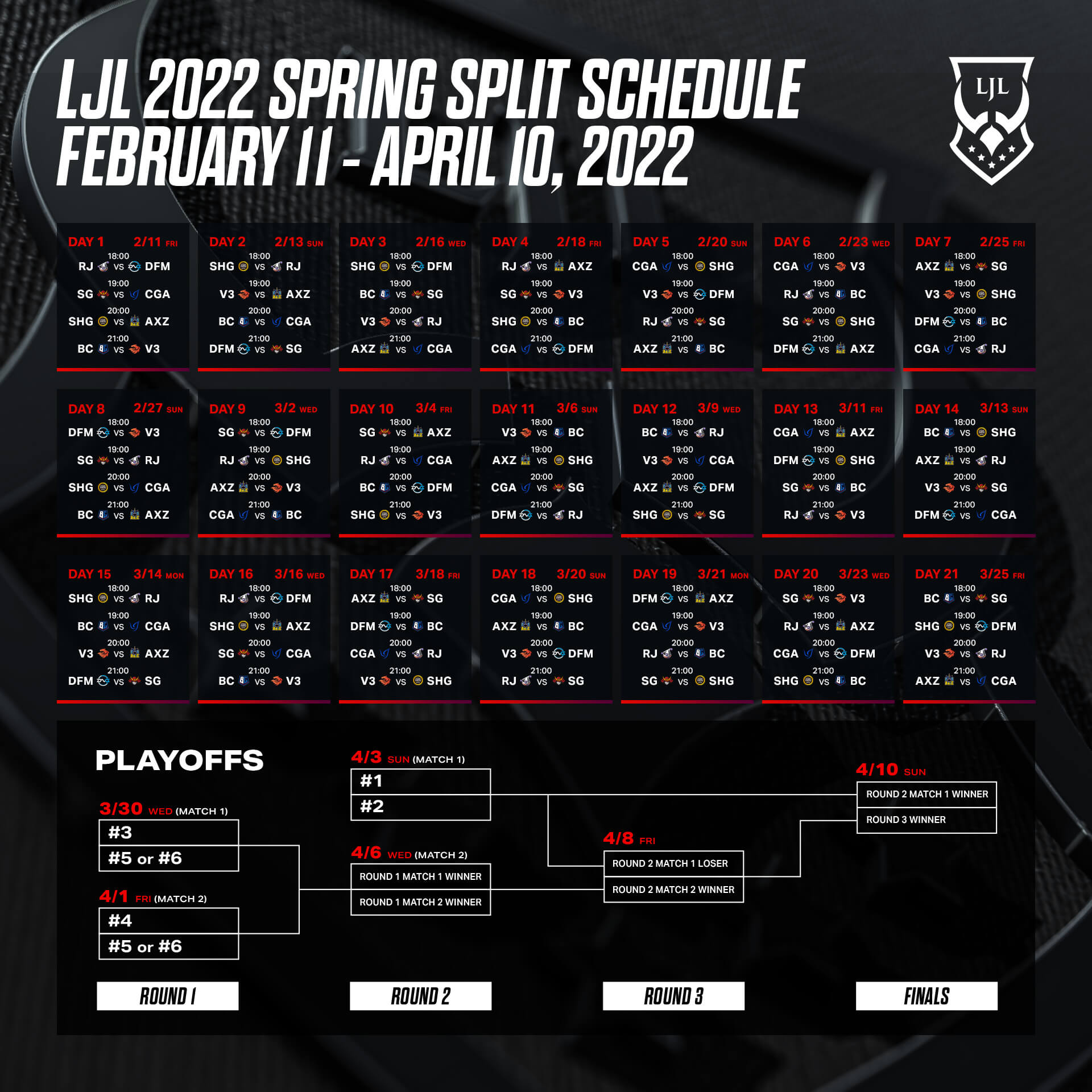 レギュラーシーズンを勝ち抜いた上位6チームが対戦。4月10日(日)のFINALSではLJL代表チームが決定し、韓国で開催される国際大会「MSI」への出場権を獲得。