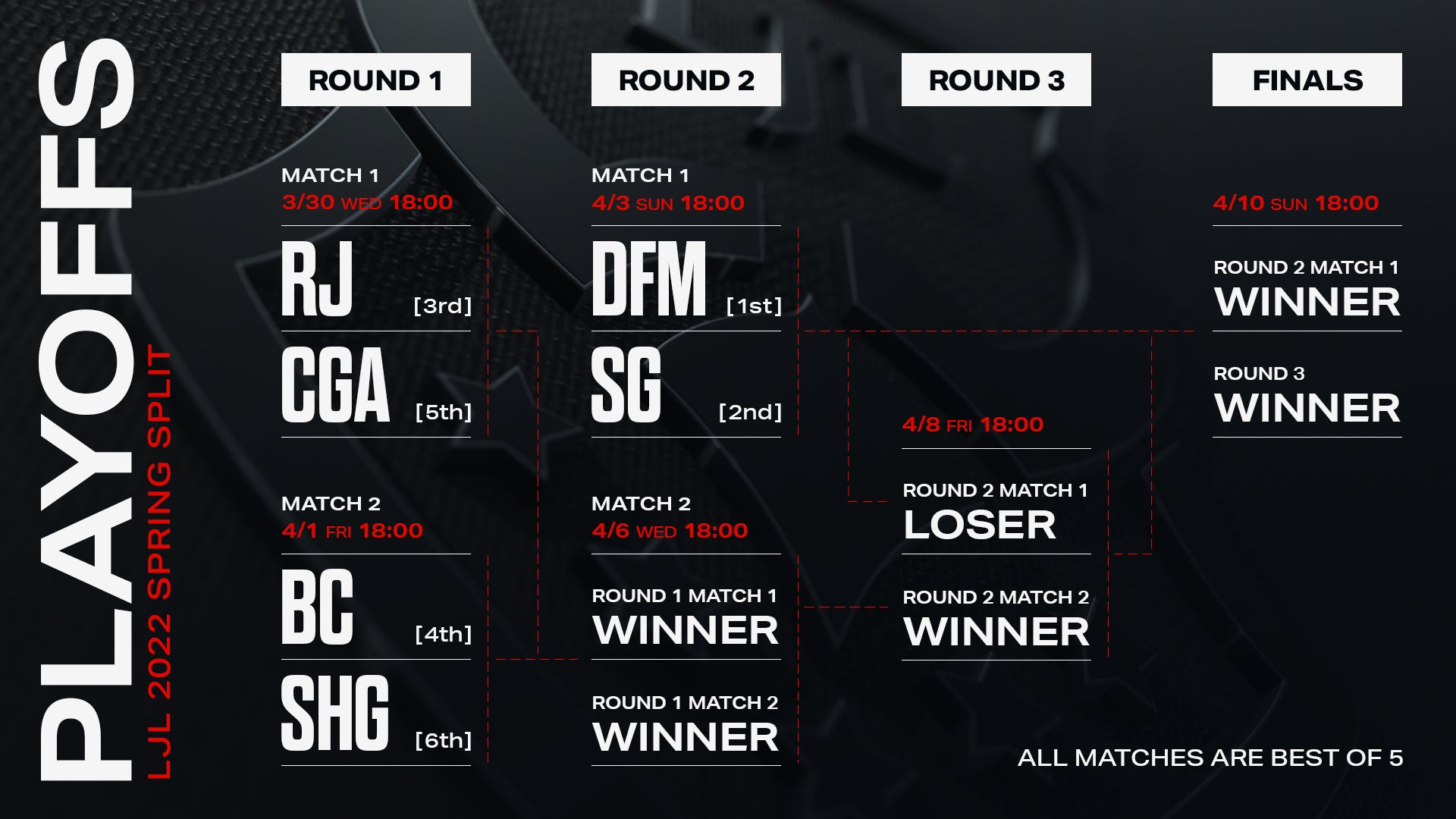 『LJL 2022 Spring Split』プレイオフでの対戦形式は「Bo5」(Best of 5[3試合を先取したチームの勝利])となり、3つのトーナメントラウンドを通して4月10日(日)にFINALSが開催されます。
