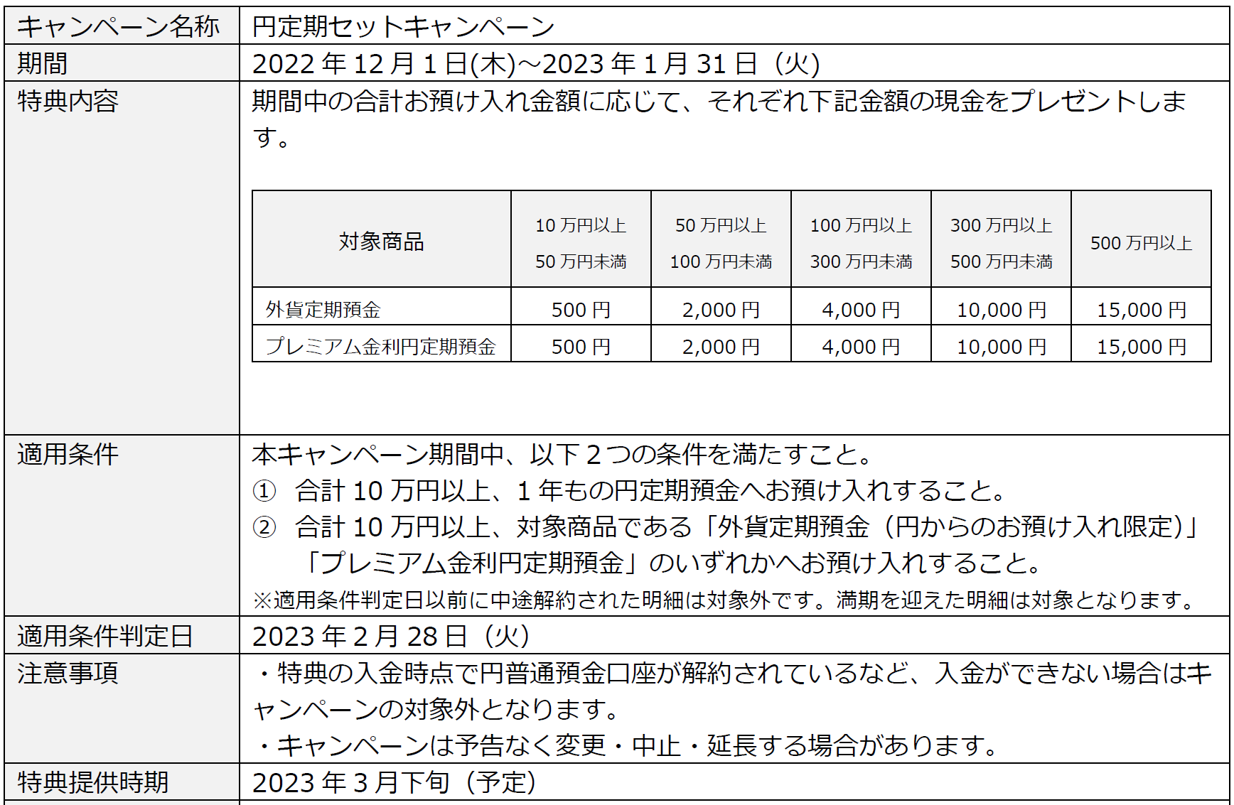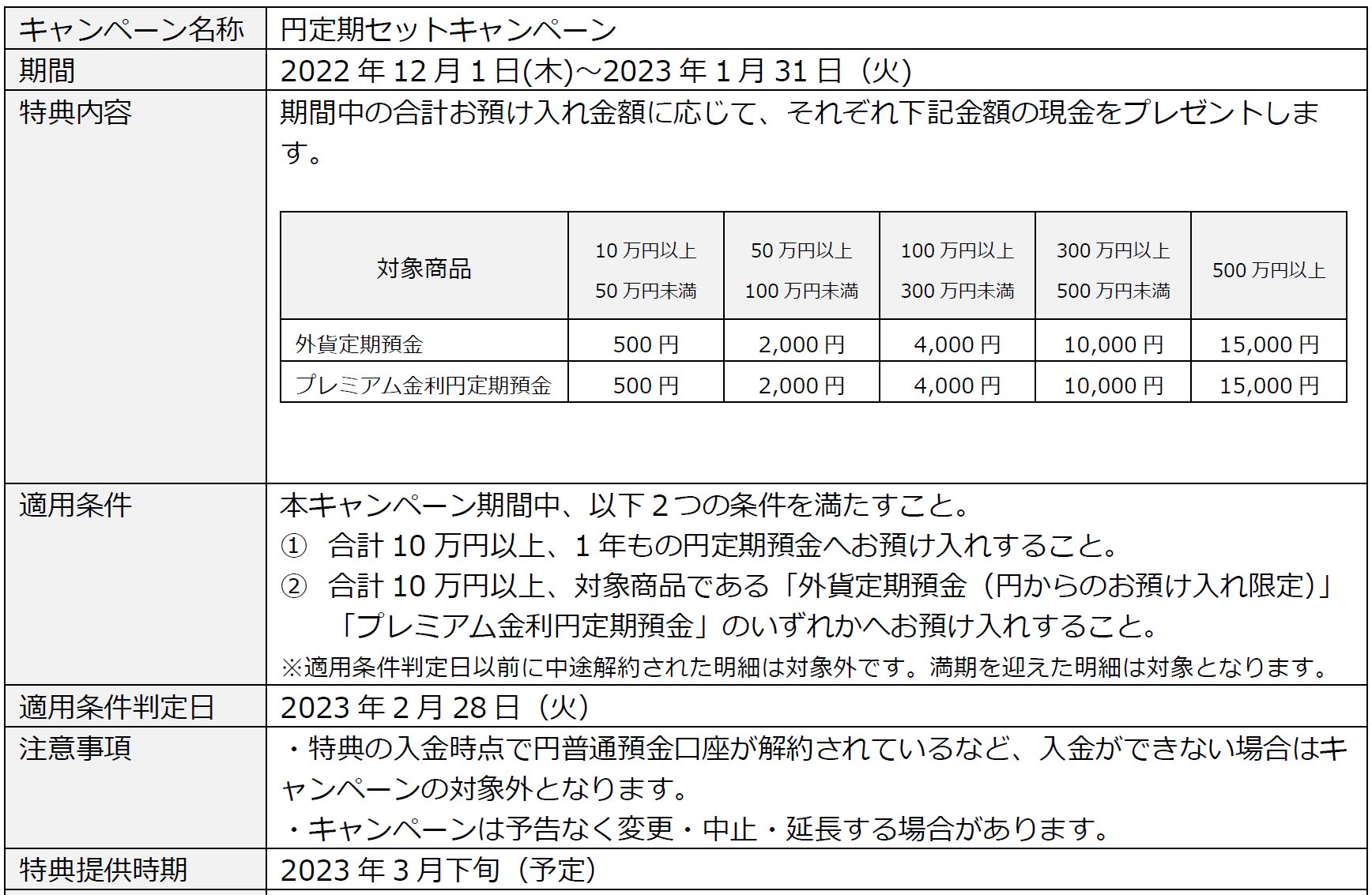 1年もの円定期預金に合計10万円以上お預け入れすることに加えて、対象商品(外貨定期預金、プレミアム金利円定期預金)のいずれかへ合計10万円以上をお預け入れすると、預け入れ金額に応じて商品ごとに最大15,000円、全商品合計で最大30,000円をもれなくプレゼントします。