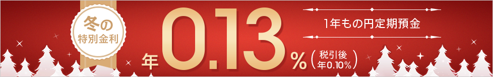キャンペーン期間中の1年もの円定期預金の新規お預け入れに対して、年0.13%(税引後 年0.10%)の特別金利を適用します。