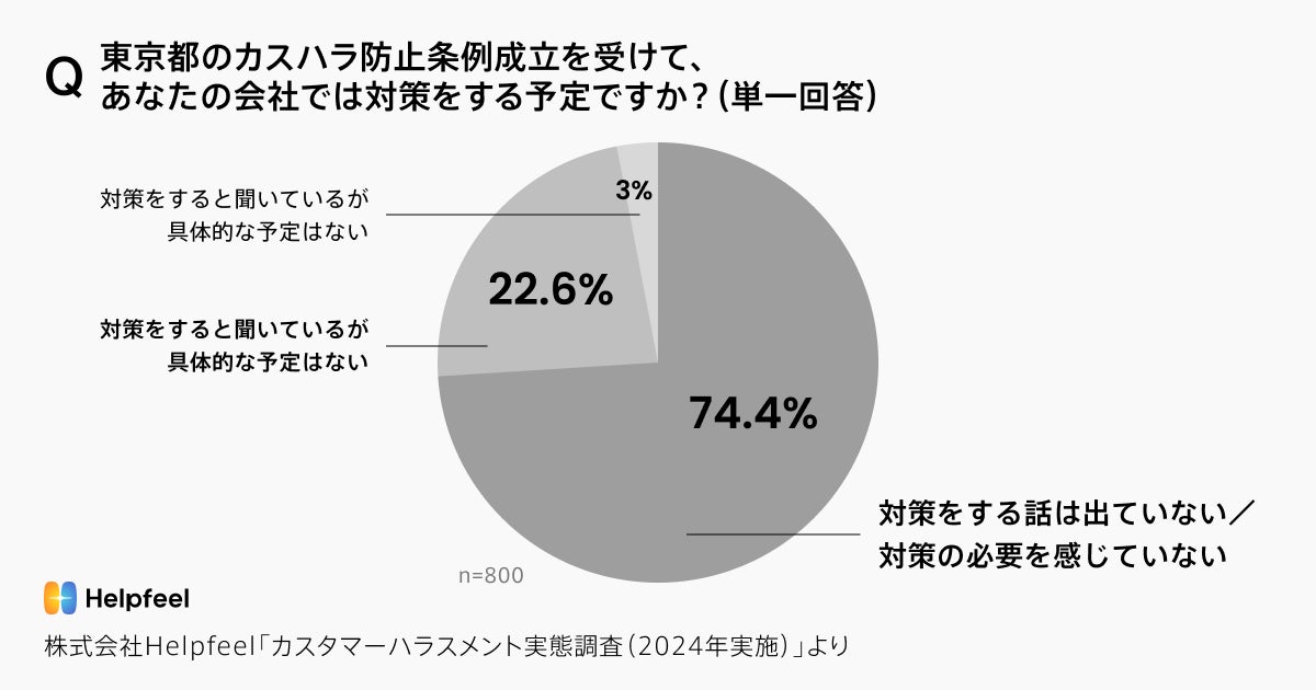 さらに、カスハラ対策を『実施していない』と回答した方を対象に、「東京都のカスハラ防止条例成立を受けて、あなたの会社では対策をする予定ですか?(単一回答)」と質問しました。この結果、7割以上が『対策をする話は出ていない/対策の必要を感じていない(74.4%)』を選択しており、多くの企業でカスハラ対策が全く進んでいない状況がわかります。