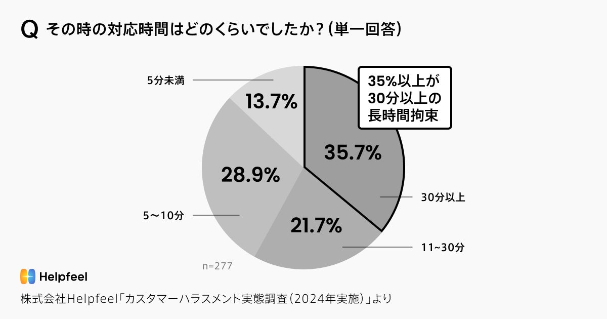 さらに、カスハラを受けた場合の対応時間については、35%以上が『30分以上(35.7%)』という長時間に渡って対応を求められていることがわかりました。