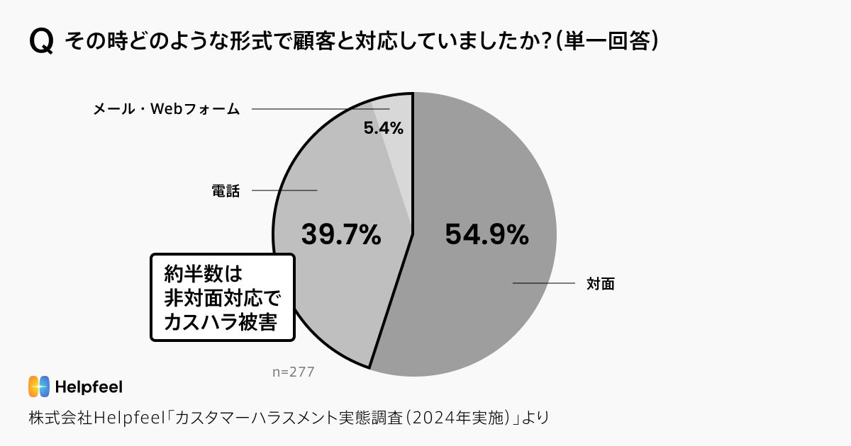 カスハラを受けた経験がある方に、カスハラ発生時の対応形式について質問したところ、『電話(39.7%)』『メール・Webフォーム(5.4%)』と約半数は非対面でカスハラを受けていたことが明らかになりました。