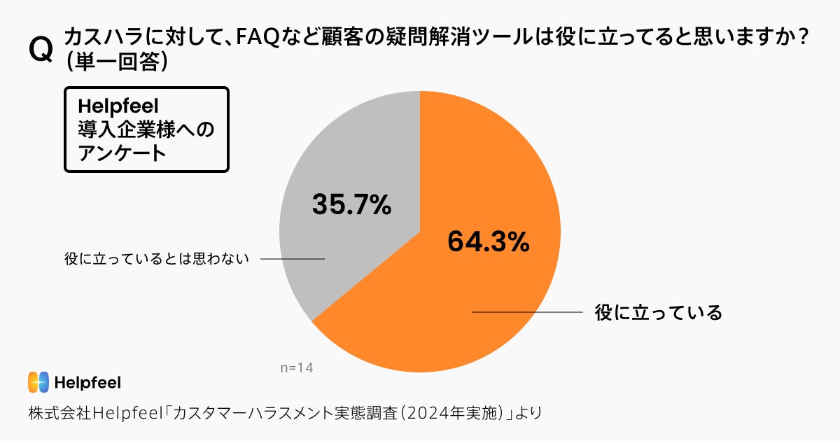 このなかで、「カスハラに対して、FAQなど顧客の疑問解消ツールは役に立っていると思いますか?(単一回答)」と質問したところ、約65%が『役に立っている(64.3%)』と回答しています。
