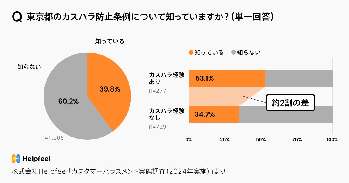 東京都カスハラ条例の認知度は約4割。カスハラ経験者の認知度は約2割高い