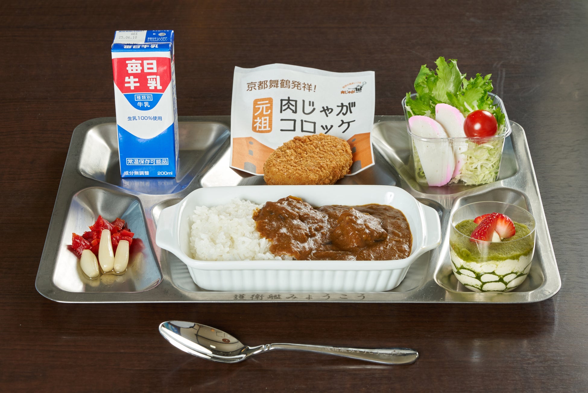 終点の西舞鶴駅がある舞鶴市には海上自衛隊 舞鶴地方隊があり、金曜日には艦内でカレーを食べる習慣があります。今回のコラボを記念して、「護衛艦みょうこう」艦内食のレシピで海自カレーを再現し、丹後くろまつ号オリジナルの盛り付けで提供します。また、舞鶴で人気のカフェ舞鶴市引揚記念公園「桟橋カフェ」特製の丹後くろまつ号オリジナルスイーツ「ムースフロマージュ~舞鶴茶の田辺城仕立て~」もあわせてお楽しみいただけます。