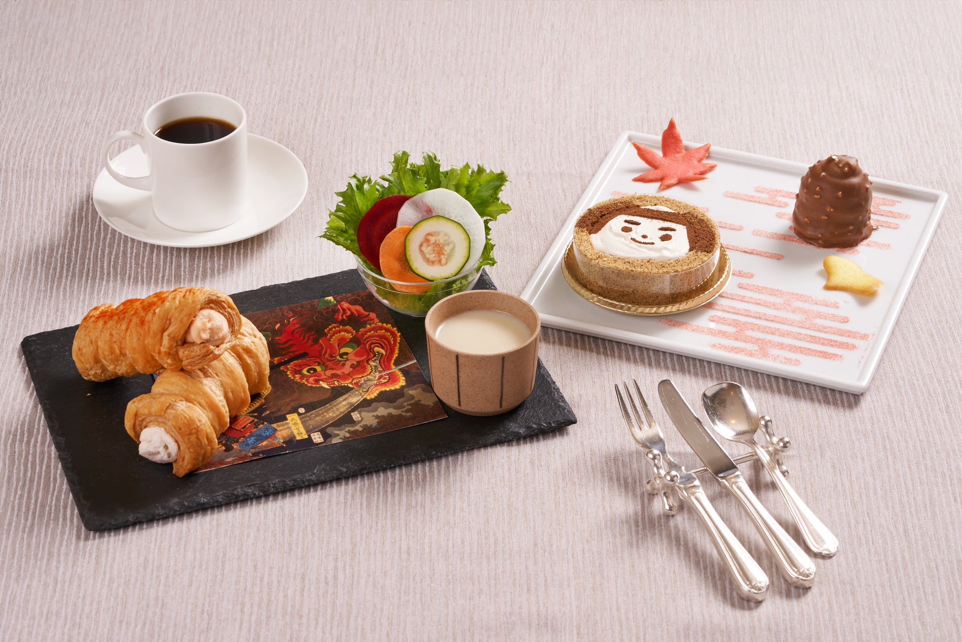 1皿目は、鬼のこん棒に見立てた食べ応えのあるパイコルネと、どぶろくが香るポタージュ、地元野菜を使った彩り豊かなサラダ。2皿目は、鬼退治に活躍した坂田金時(金太郎)と伝説の舞台「大江山」を連想させるデザート2品をお楽しみいただけます。