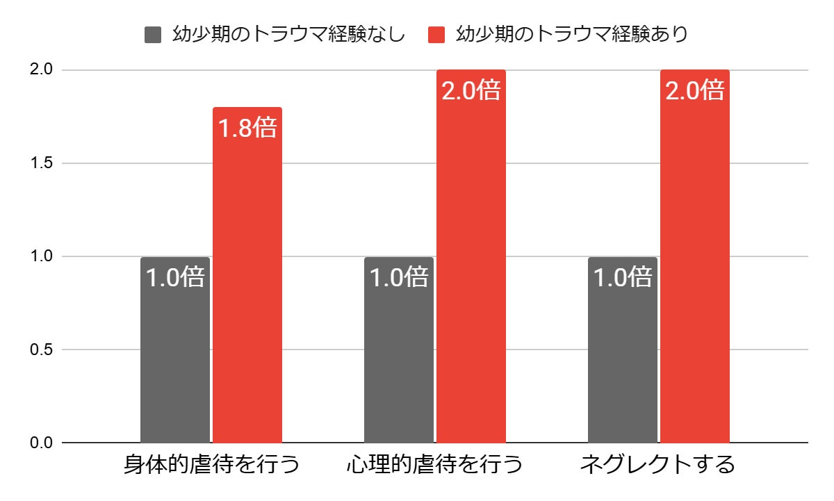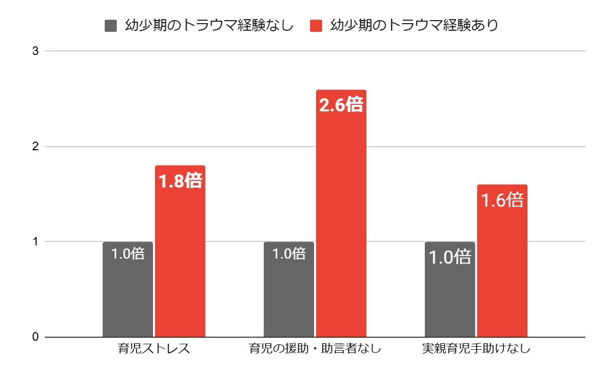 実際、幼少期に虐待、ネグレクト等の逆境的体験(ACE:Adverse Childhood Experiences)をした人(ACEサバイバー)「※1」は、虐待等を受けていない人と比較して、我が子への虐待・ネグレクトが1.8~2.0倍 、育児ストレスが1.8倍、育児の援助・助言者なしが2.6倍という研究データがあります「※2」。人に頼れず、ストレスを抱え、孤独な育児の中、虐待をしてしまう苦しい姿が浮かび上がります。
