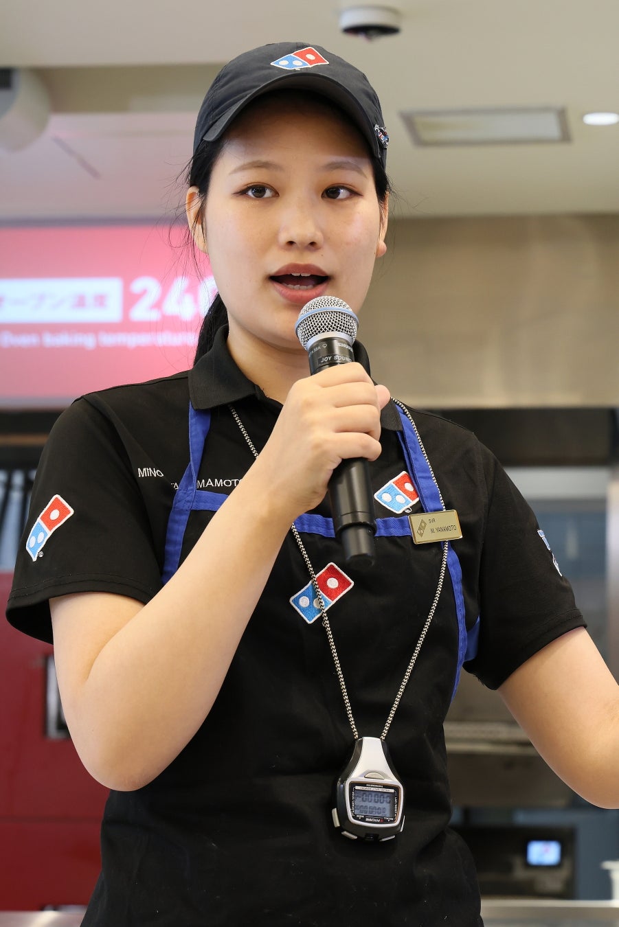 「FPMCとは、正式名称Fastest Pizza Maker Competitionといい、ドミノ・ピザが1年に1回社内で行っている、ピザづくり大会です。ピザメイカーが3枚のピザを作り、スピード、生地とソース、トッピングの量、トッピングの配置について競い合う、最強のピザメイカーを決める競技です。そんなピザづくりにアツい情熱を持った者たちが世界から集まる、アツい競技でアジア1位・世界9位を獲得した高井さんの技術はもちろんのこと、大舞台でも物怖じしないメンタルの強さや笑顔も注目していただきたいところです」と高井への期待を寄せました。
