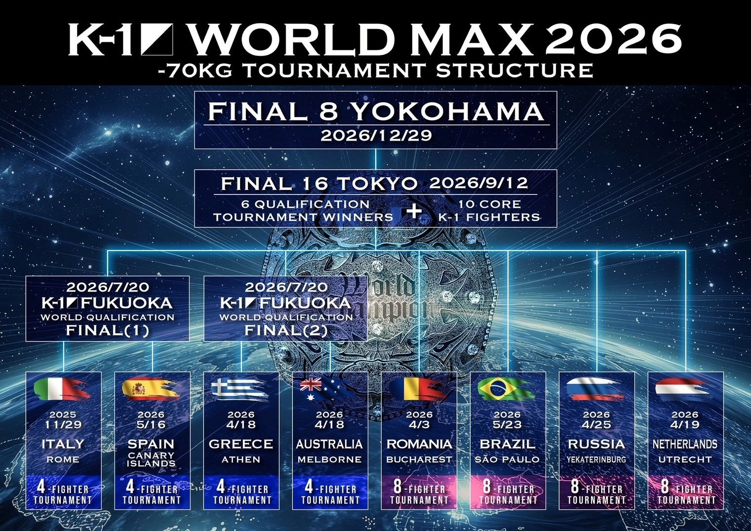 ルーマニア、ブラジル、ロシア、オランダは8名のワンデイトーナメントを行い、優勝した4名が9月12日(土)「K-1 WORLD MAX 2026」(東京・国立競場第二体育館)のFINAL16へ進出。イタリア、スペイン、ギリシャ、オーストラリアは4名のワンデイトーナメントで優勝者が7月20日(月・祝)にマリンメッセ福岡B館で行われる「ECO信頼サービス株式会社PRESENTS K-1」へ駒を進め、イタリアvs.スペイン、ギリシャvs.オーストラリアの勝者がFINAL16の出場権を獲得する。