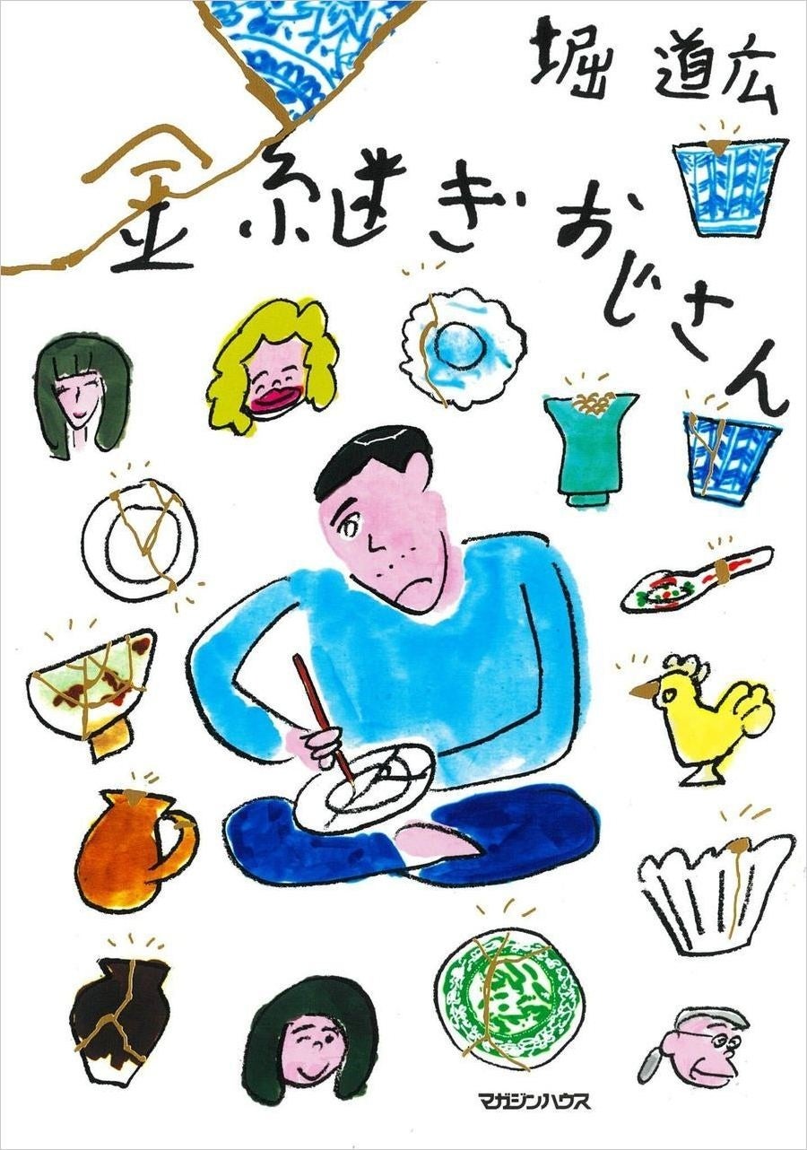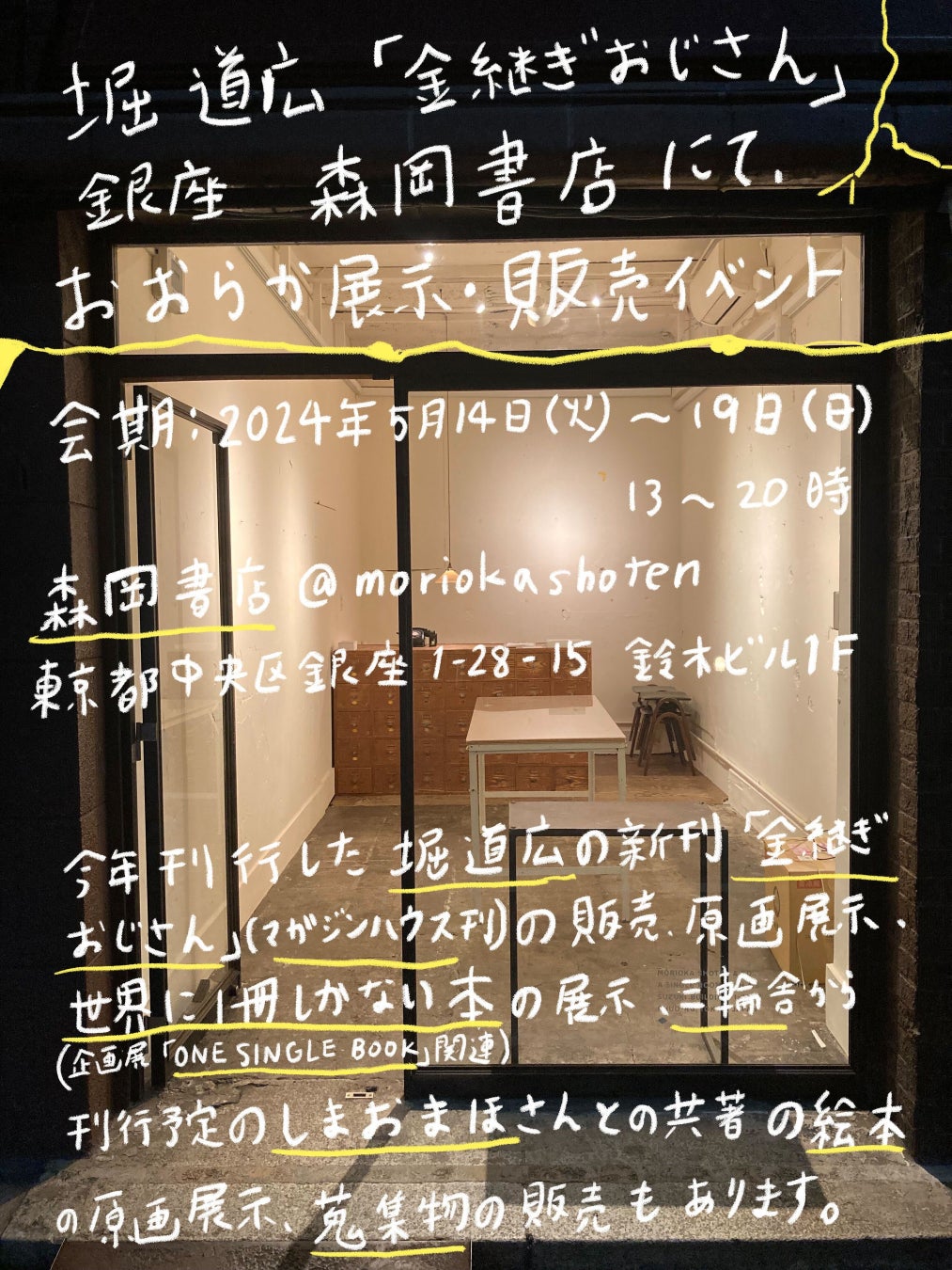 堀道広さんの新刊『金継ぎおじさん』(マガジンハウス刊)の原画展を5月14日(火)より銀座・森岡書店で開催。堀さんが金継ぎした器や蒐集した古物の展示・販売、しまおまほさんとの共作絵本の原画も特別展示!