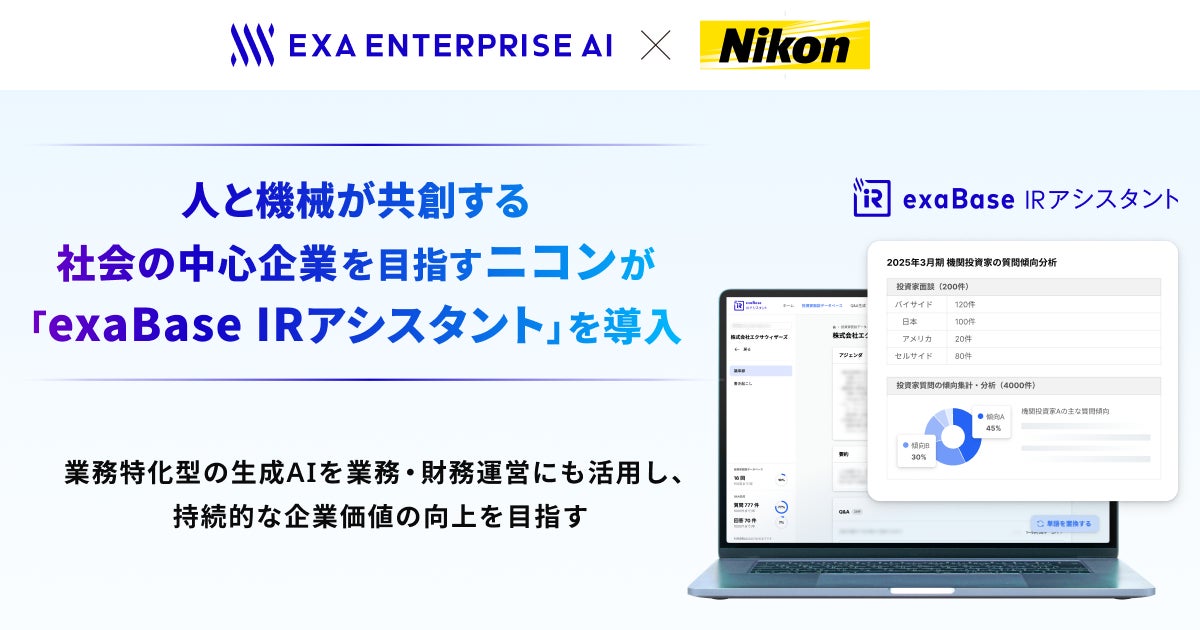 株式会社エクサウィザーズ(東京都港区、代表取締役社⻑ CEO︓春⽥ 真、以下エクサウィザーズ)のグループ会社である株式会社Exa Enterprise AI(東京都港区、代表取締役:大植 択真、以下Exa Enterprise AI)は、株式会社ニコン(以下ニコン)が当社の「exaBase IRアシスタント」の導入を開始したことをお知らせします。ニコンは、業務特化型AIエージェントを、株主・投資家向けの情報開示やIR説明会・個別面談に関係する部門で活用することで担当者の業務DXを推進し、付加価値の高い情報開示と対話に注力できる体制の実現を図ります。
