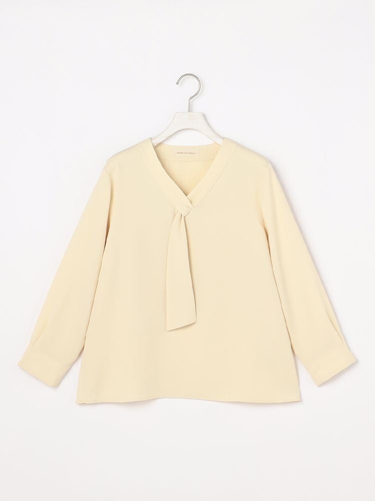 ボウタイのワンポイントがクールな印象のブラウスは Vネックの空きが抜け感と女性らしさを演出してくれる一枚です。パンツスタイルのオケージョンスタイルと高相性。同色系のスカートを合わせてワンピース風の上品なスタイリングも楽しめます。