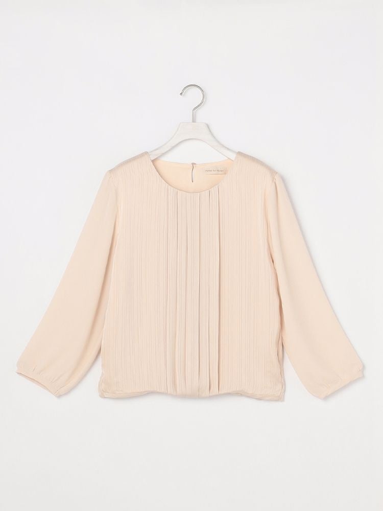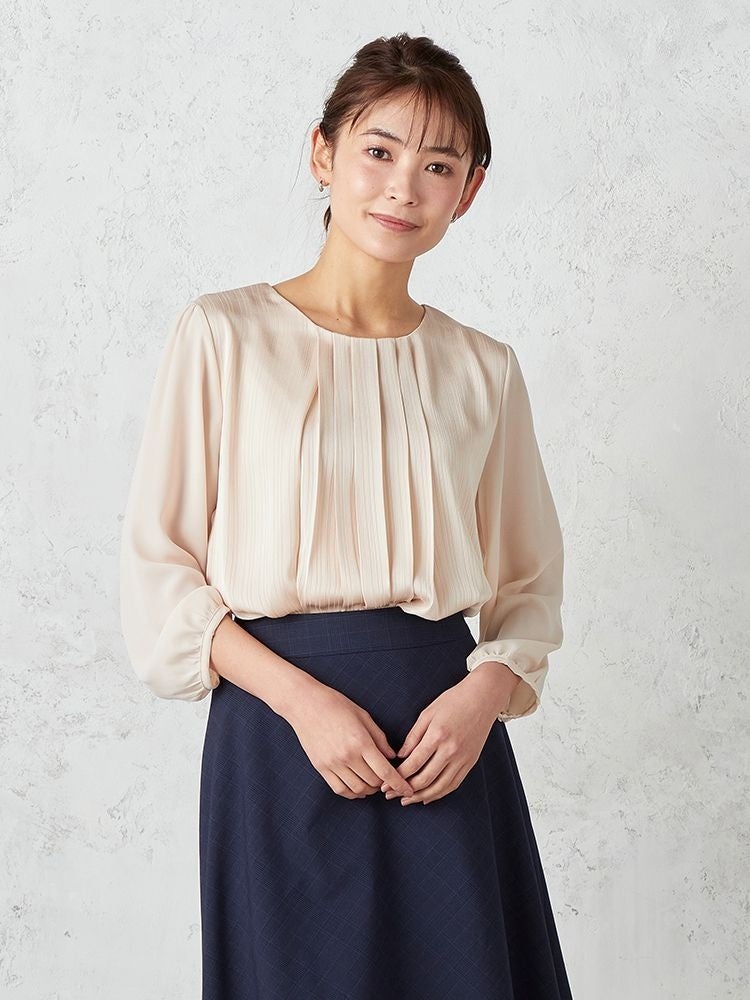 フロント切り替えがサテンのような滑らかなデザインで上品な印象のブラウスはツイード調のジャケットなどと相性良く、セレモニーシーンにぴったりです。春らしい明るめカラーがフェミニンな印象の一枚です。