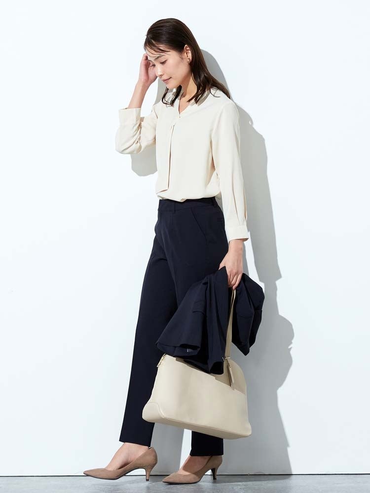 では、得意とするビジネスウェアのベーシックなデザインをベースにワンポイントをあしらったブラウスの展開を開始いたしました。スーツのインナーとしてはもちろんのこと、セレモニーシーンでの着用も可能です。セレモニースーツとして選ばれることの多いベージュ系のジャケットやツイード調のセットアップなどに馴染む春らしく優しいカラーを採用し着回しの幅が広いブラウスとなっております。
