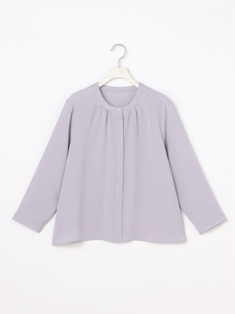 シンプルで着回しやすいブラウスのボタンパーツを2つにし、華美にならないアクセントを付けました。ビジネスなどのかっちりシーンをはじめセレモニースーツのインナーとしても活躍。コサージュなどのアクセサリーをつけても邪魔しないベーシックな一枚です。