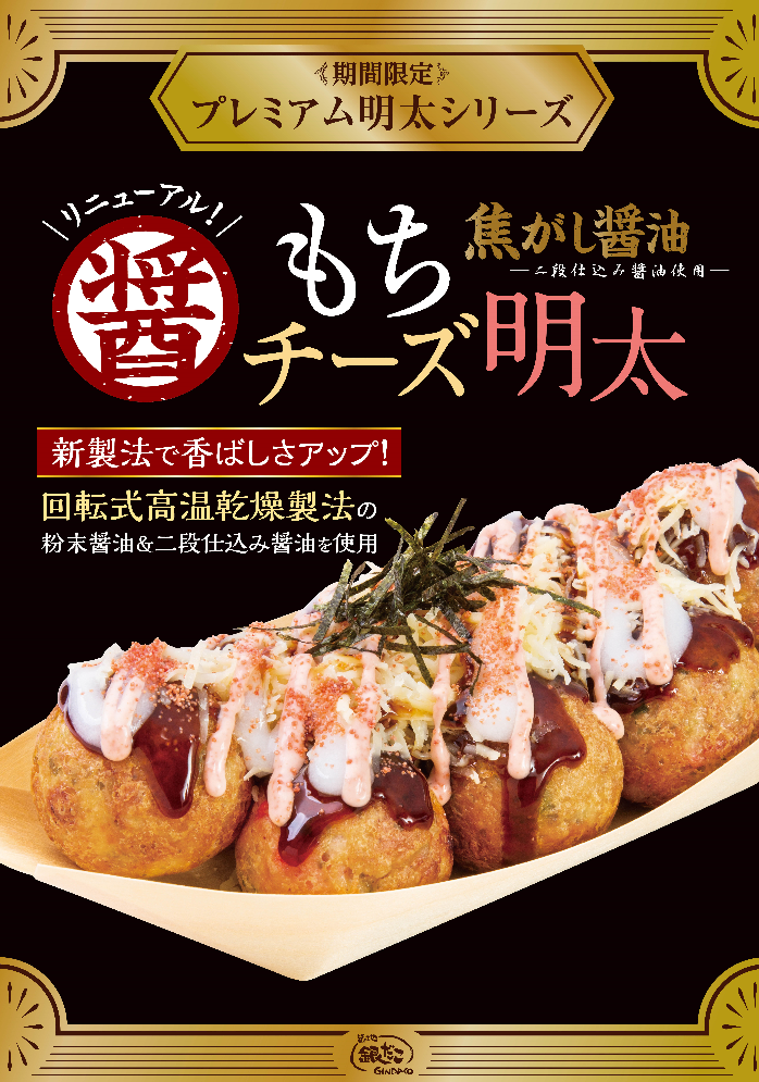 また、焦がし醤油には相性抜群の “もち” は、特殊製法で作られた 「固まらない もちソース」 を使用。特製だれや各トッピングにも “とろ~り” と絡み、濃厚なハーモニーがお口いっぱいに広がります。この時季に食べたくなる 「焦がし醤油」 と 「もち」 という組み合わせに、「モッツァレラチーズ」 と 「明太マヨネーズ」、さらに 「乾燥させた博多明太子」 をふりかけて仕上げた、まさに<プレミアムシリーズ>ならではの逸品!この季節しか味わえない贅沢な商品をぜひお楽しみください。