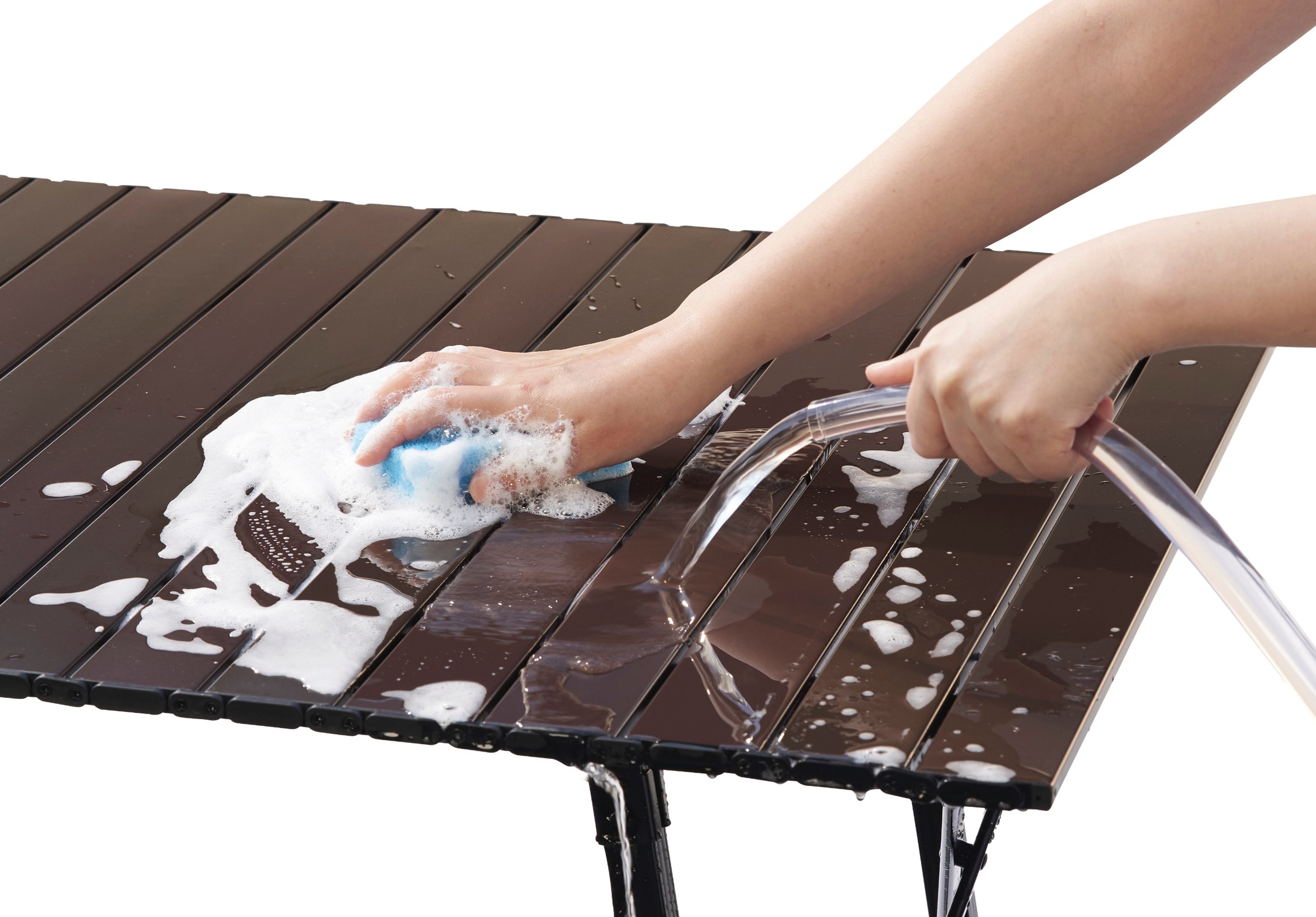 本シリーズは、高さを調節できるアジャスター機能が4脚それぞれについているテーブルです。無段階調節可能で、階段や傾斜など高低差のある地面などでも水平に設置することができるので便利です。天板や脚フレームには、水に強いアルミパーツを採用しているため錆びにくく、丸洗い可能です。食器用洗剤での丸洗いにも対応しており、汚れても簡単に落とすことができるので、汚れを気にせずアクティブに使用できます。脚フレームは分割式でチェア並みにスリムな収納が実現し、持ち運びや保管も省スペースです。