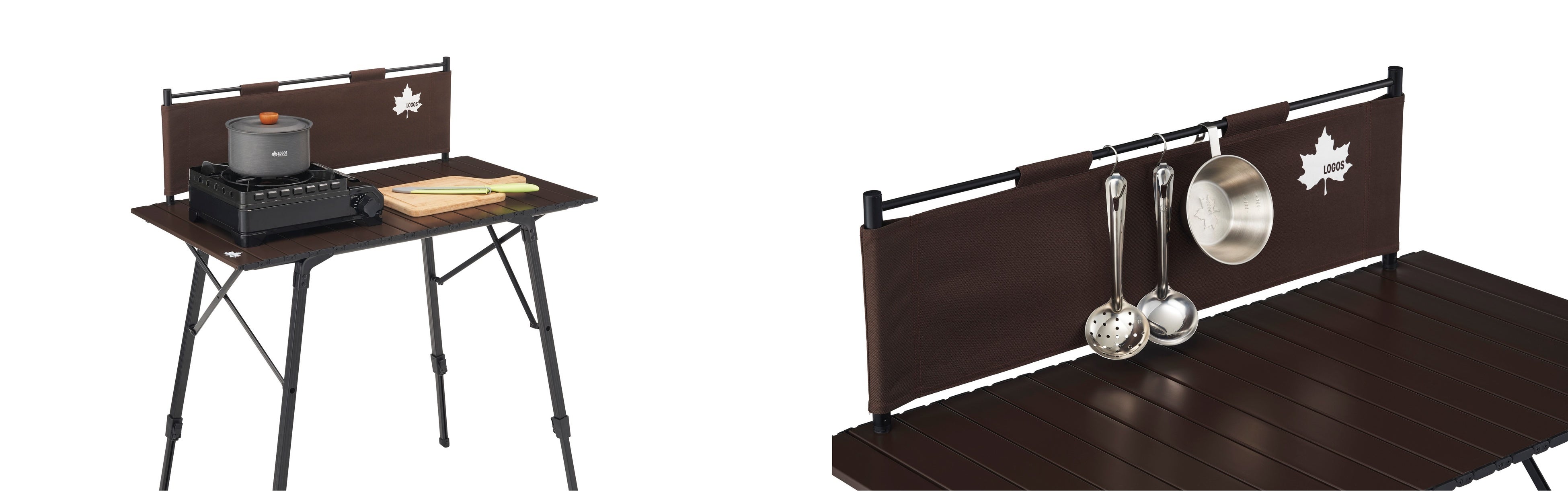 「丸洗いアジャスタキッチンテーブル」は、ゆったりと快適に使える調理台です。取り外し可能な風防が付いており、屋外でも風を気にせずにコンロでの調理ができるので、冬のアウトドア調理で活躍します。風防にはシェラカップなどを引っ掛けることができるほか、市販のS字フックを取り付ければ調理器具を吊るすこともでき、アイデア次第で使い方の幅が広がります。