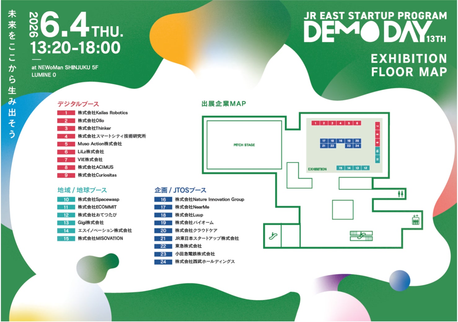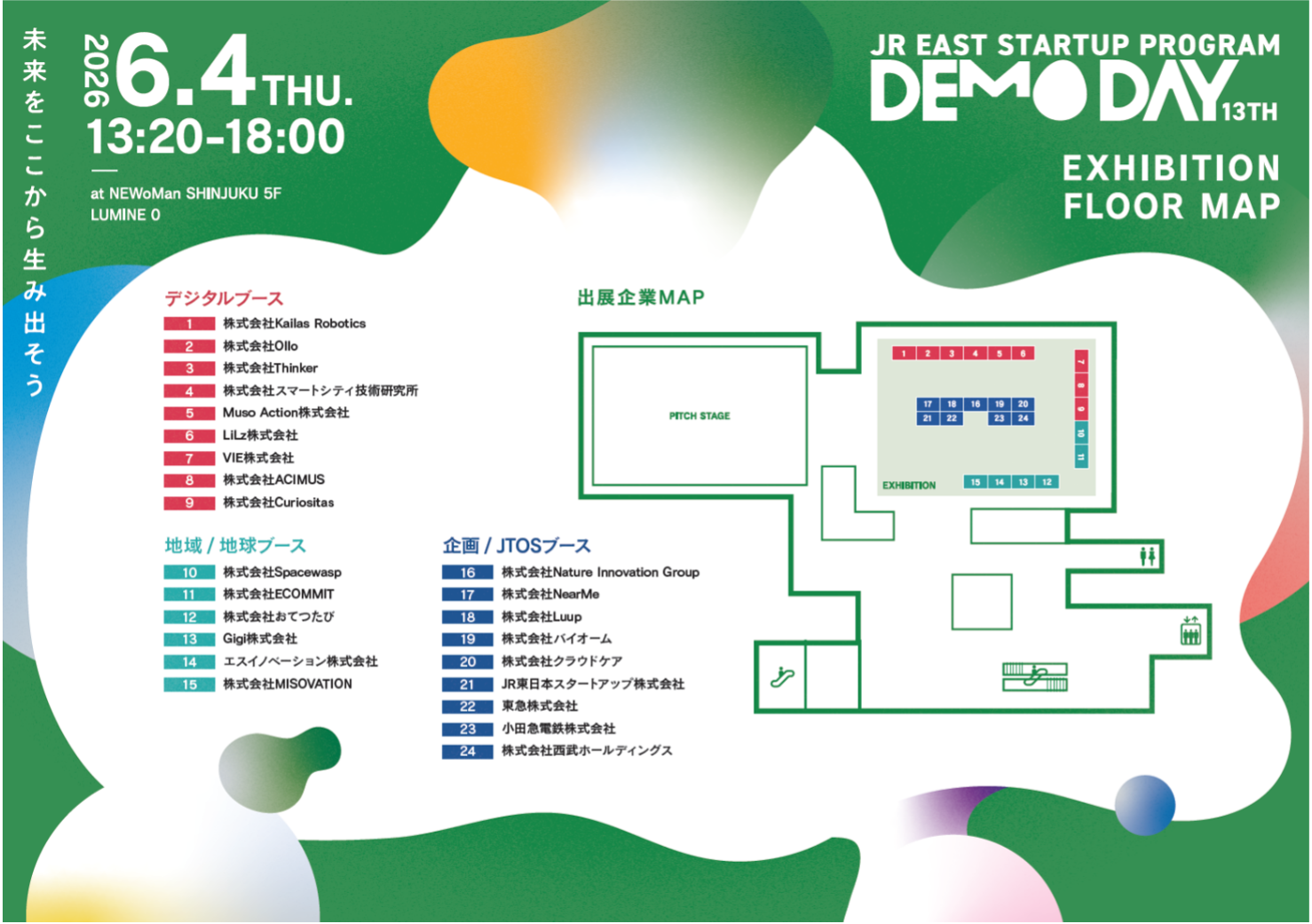 ○ 13回目となる今回は、これまでのプログラム採択企業や2025秋プログラムの採択企業が集まるリアルイベント「第13回JR東日本スタートアッププログラムDEMODAY」を6月4日(木)にJR新宿駅LUMINE0<ルミネゼロ>で開催します。