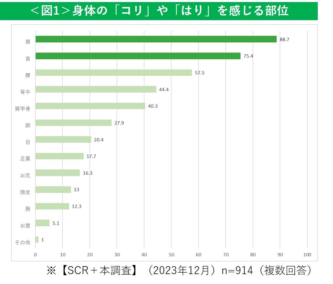 ピップが914名を対象に実施した調査で、身体の「コリ」や「はり」を感じる部位について聞いたところ、一番は、「肩(88.7%)」となっており、次いで「首(75.4%)」が高い結果となりました<図1>。