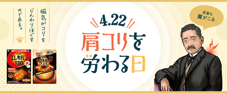 日本人がコリの症状を自覚するようになったきっかけとして、1910年4月22日、夏目漱石が朝日新聞の連載『門』の一節に「指で圧してみると、頸と肩の継目の少し背中へ寄った局部が、石のように凝っていた。」とコリに関する記述をしたことがひとつとされています。その記述がされた日と、「しんどい(4)コリ、つらい(2)つらい(2)」と読む語呂合わせから、2020年より、4月22日を「肩コリを労わる日」に制定し、一般社団法人 日本記念日協会に認定されました。