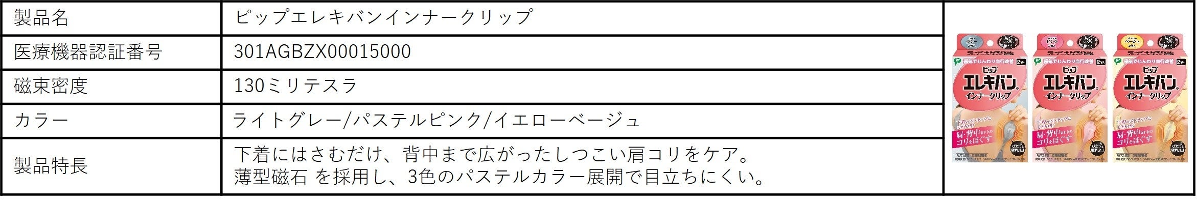 「ピップマグネループ」:「ピップマグネループ」。磁気の力で筋肉組織の血行を改善して緊張をとき、首・肩のコリをほぐします。効果は、装着部位のこり及び血行の改善です。