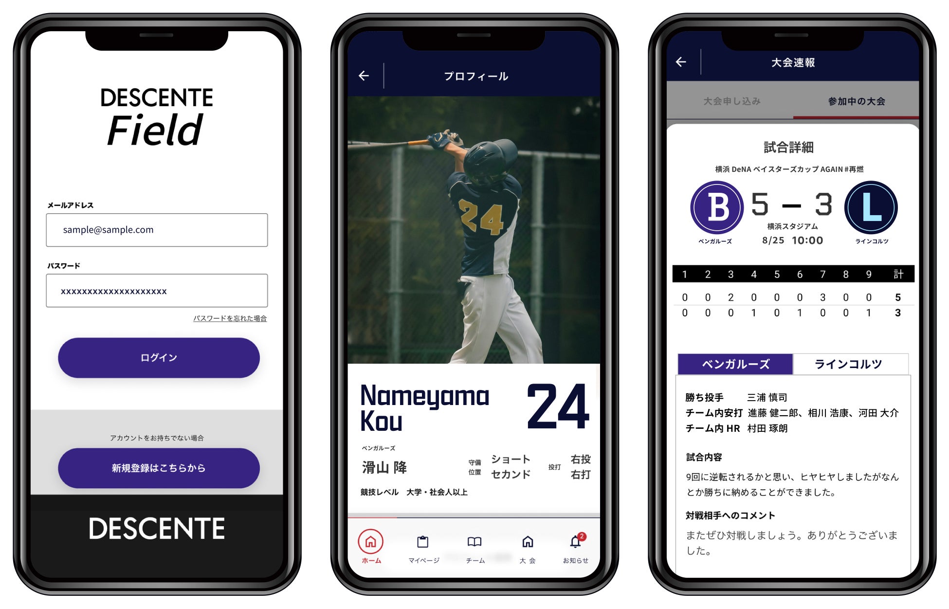 「DESCENTE Field」は、まずは競技人口の多い野球に特化して、「チーム作成」「個人プロフィール作成」「大会エントリー」「大会管理」などの機能を備えてスタートします。本サービスを利用することで、ユーザーはWEB上でチームのメンバーや大会へのエントリー、試合成績が一括管理できるようになります。また、大会の運営者はWEB上で参加者や試合結果を一括管理でき、情報共有や結果の報告などを手軽に行うことが可能です。今後は「DESCENTE Field」から参加申し込みをする大会や、登録ユーザー数を積極的に拡大し、さらなる機能拡張を行いながら、野球以外のチームスポーツへサービスを広げていきます。