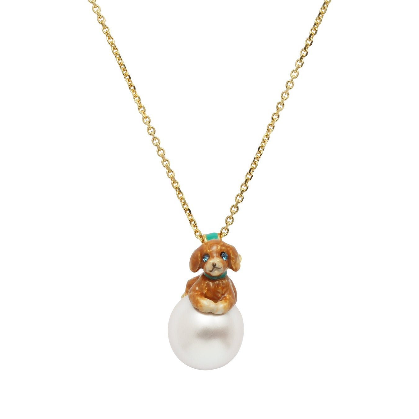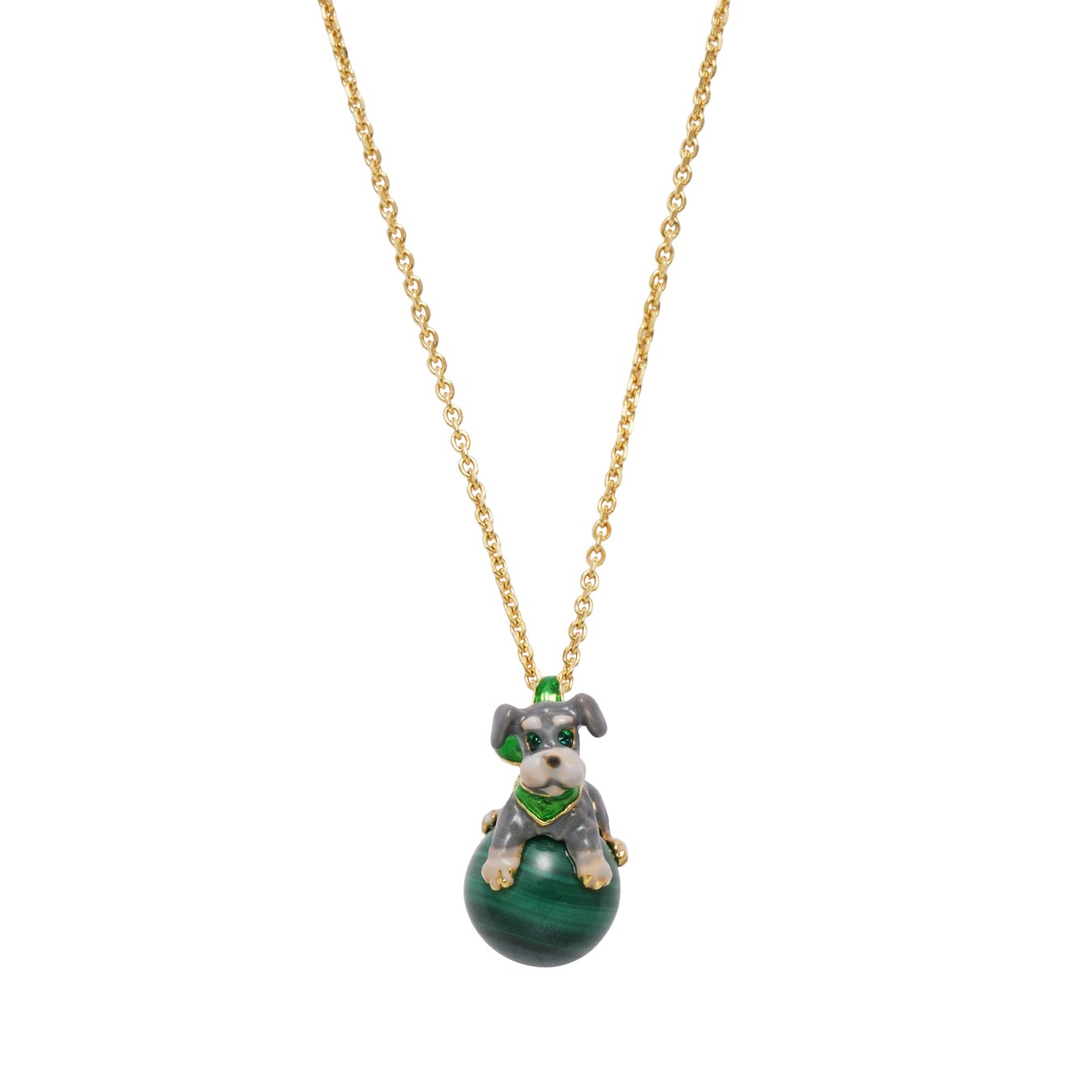 ネックレスは気ままにボール遊びをする姿を表現。 熟練した職人によって手作業で描かれたブラウンカラーに、首にまとったミントブルーのリボンがポイント。