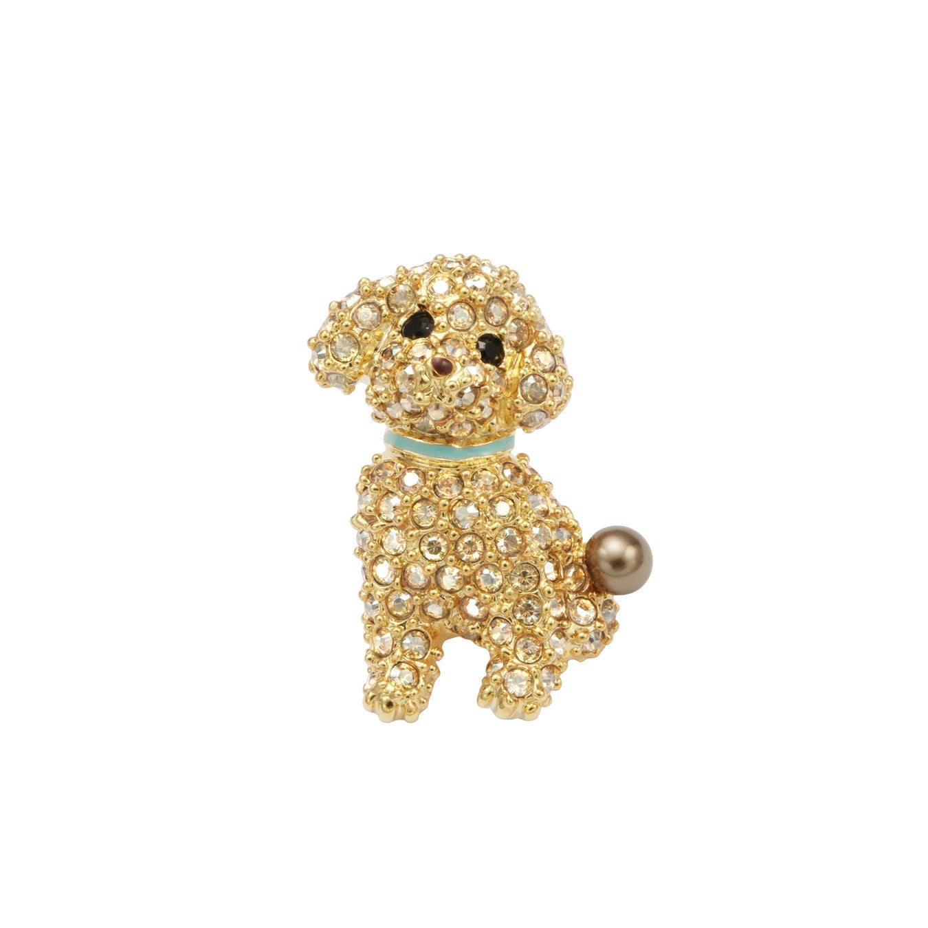 ブローチは柔らかなゴールドカラーに、ミントブルーの首輪がチャーミング。つぶらな瞳にお座りポーズがとってもキュートです。