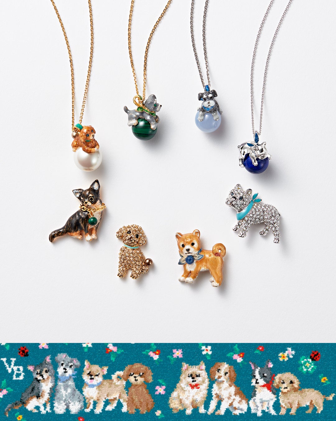 アクセサリーはミニチュアシュナウザー・柴犬・フレンチブルドッグ・チワワ・トイプードルの5種類で展開。ボールに見立てた天然石やパールの上で遊んでいる様子を表現したネックレスとディテールにこだわったキュートなブローチです。