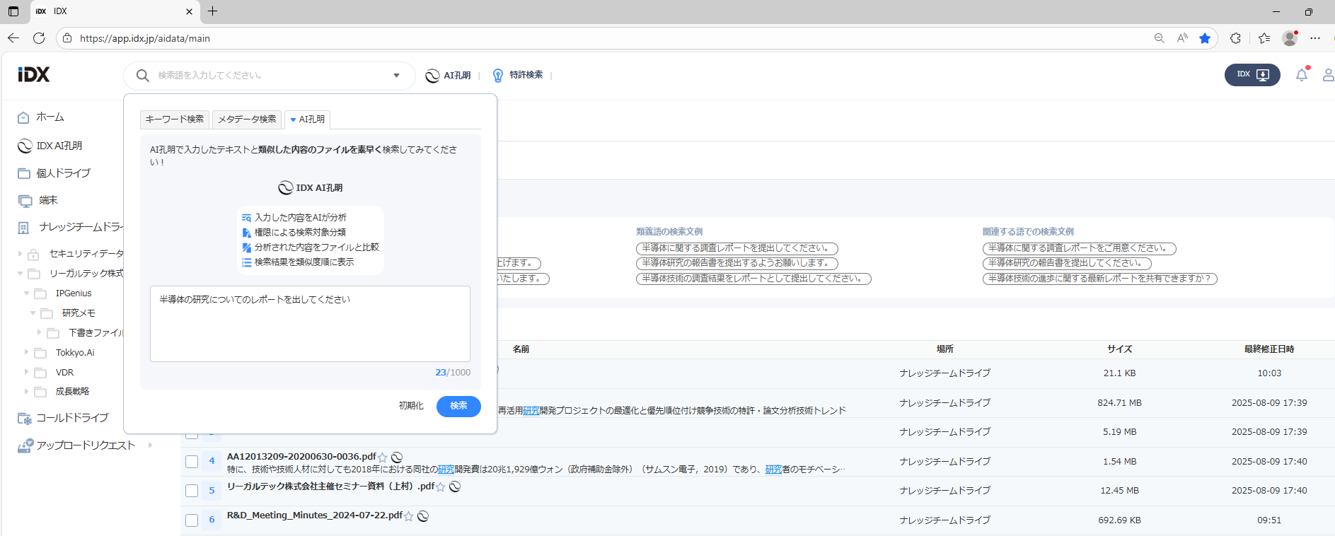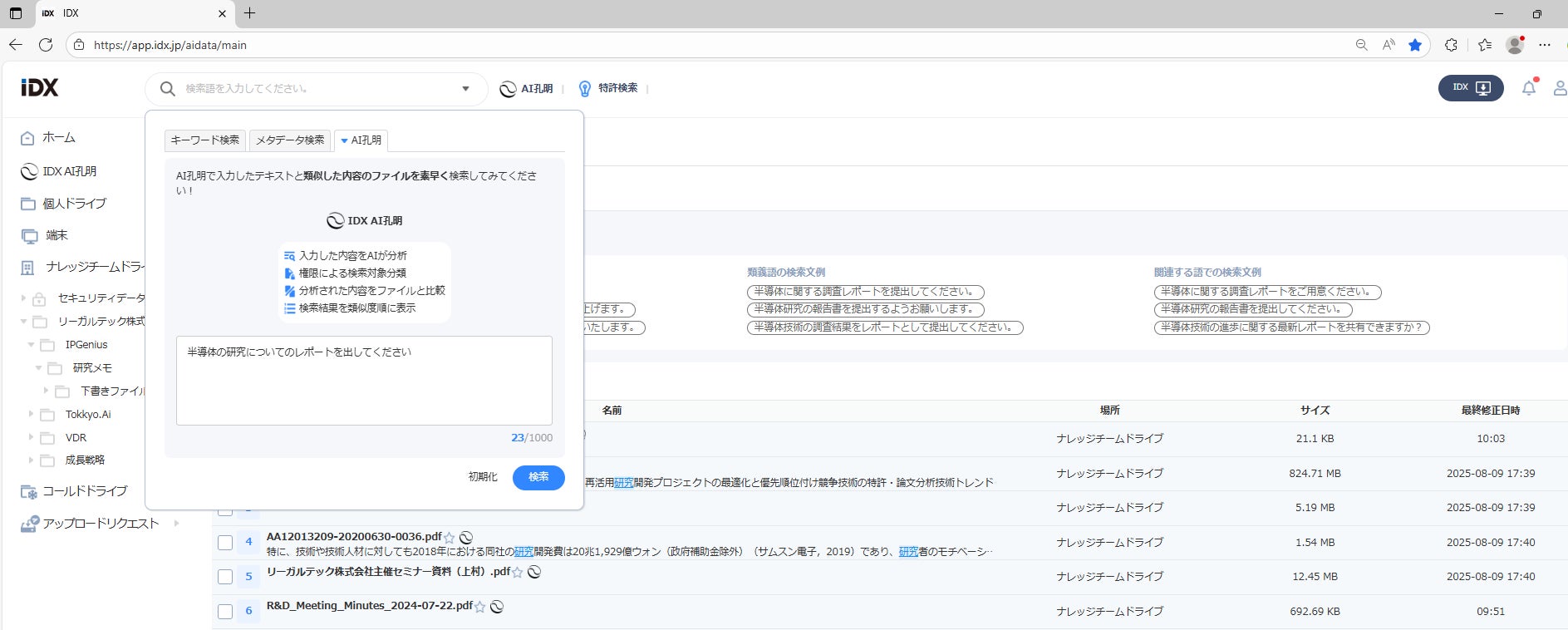 AI IPGenius on IDX は、社内に散在する構造化・非構造化データを横断的に統合理解し、技術ナレッジを再活用できるようにする生成AI基盤である。主な特徴は以下のとおりである。