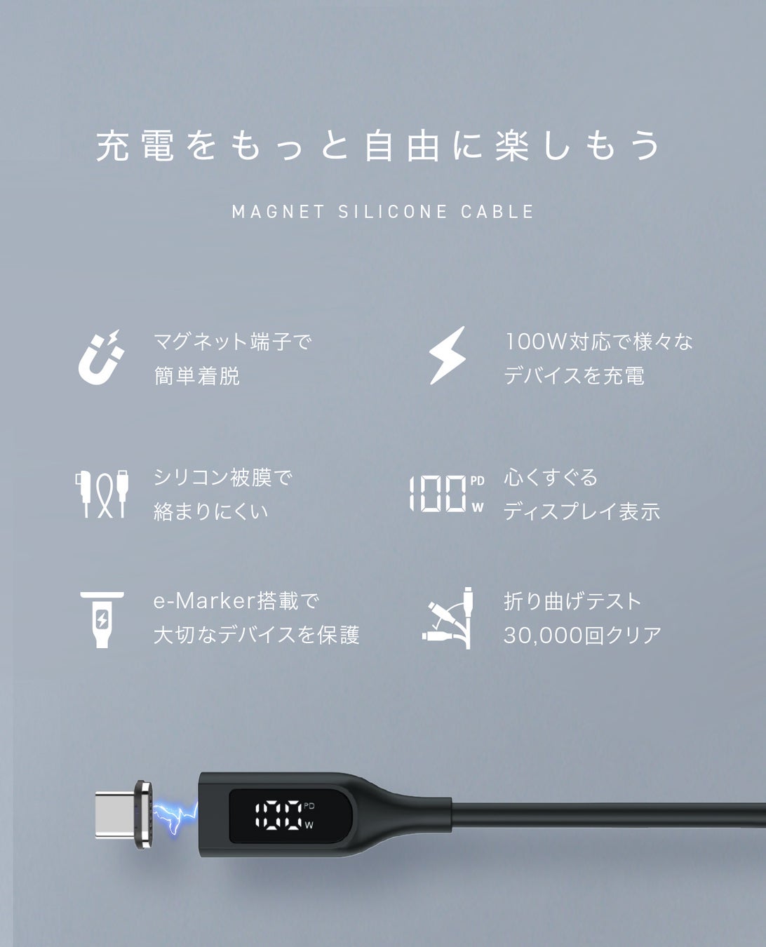 なめらかなシリコン素材のマグネットケーブル・100W対応・出力表示ディスプレイ・iPhone15対応