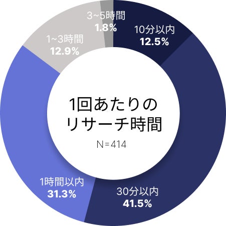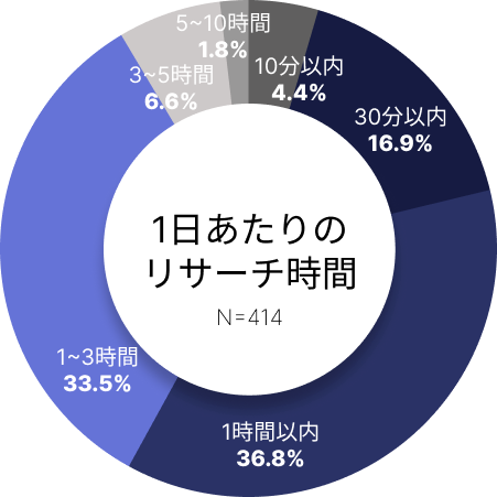 当社が行った調査によれば、414人の企業法務担当者に対する質問の結果、1日の法務リサーチ時間は1時間以内と1時間〜3時間の合計で、全体の70%以上を占めています。また、1回のリサーチ時間は30分以内と1時間以内の合計がこちらも全体の70%以上を占めています。これらの結果から、企業法務の1日の業務時間の約10%〜30%がリサーチに費やされていることが明らかになりました。