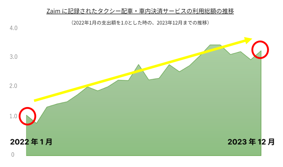 以下はZaim に記録された主要なタクシー配車・車内決済サービスの利用総額推移です。2022 年1 月と 2023 年 12 月の時点を比較すると、タクシー配車・車内決済サービスの利用総額は約 3 倍にまで伸長していることがわかります。移動におけるDX化が定着し、ユーザーの簡便性が高まりつつあるようです。