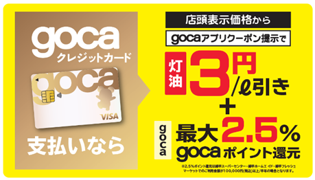 灯油ご購入時、「gocaアプリクーポン」をご提示で、店頭表示価格から3円/L値引き+さらに最大2.5%のgocaポイントを還元!