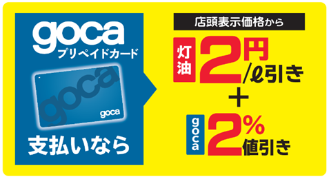 灯油ご購入時、「gocaプリペイドカード」でのお支払いで、店頭表示価格から2円/L値引き+さらにその場で2%を値引き!