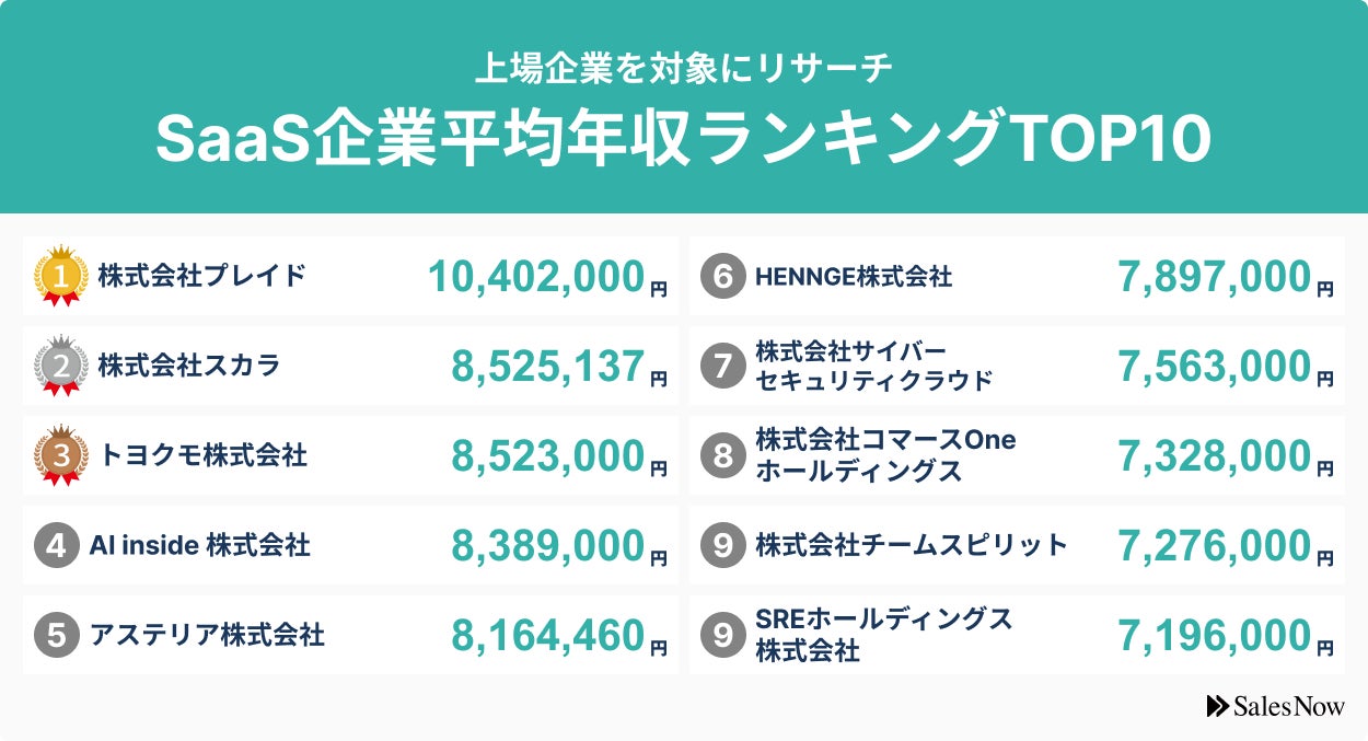 上場SaaS企業平均年収ランキングTOP10を発表!/SalesNow DBレポート
