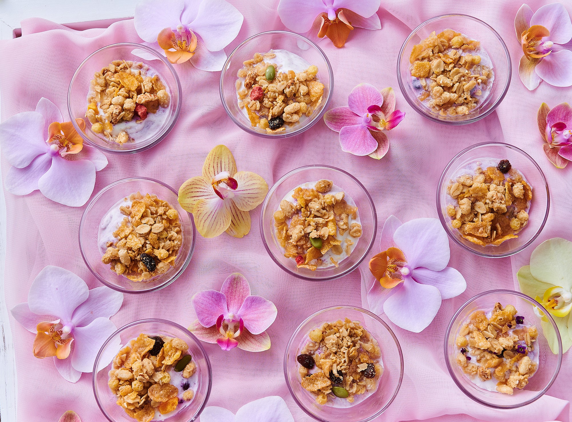 (左)グァバゼリーやミニマカロンなど彩り豊かなスイーツを揃えた(右)玄米フレークやドライフルーツをトッピングしたブルーベリーヨーグルト
