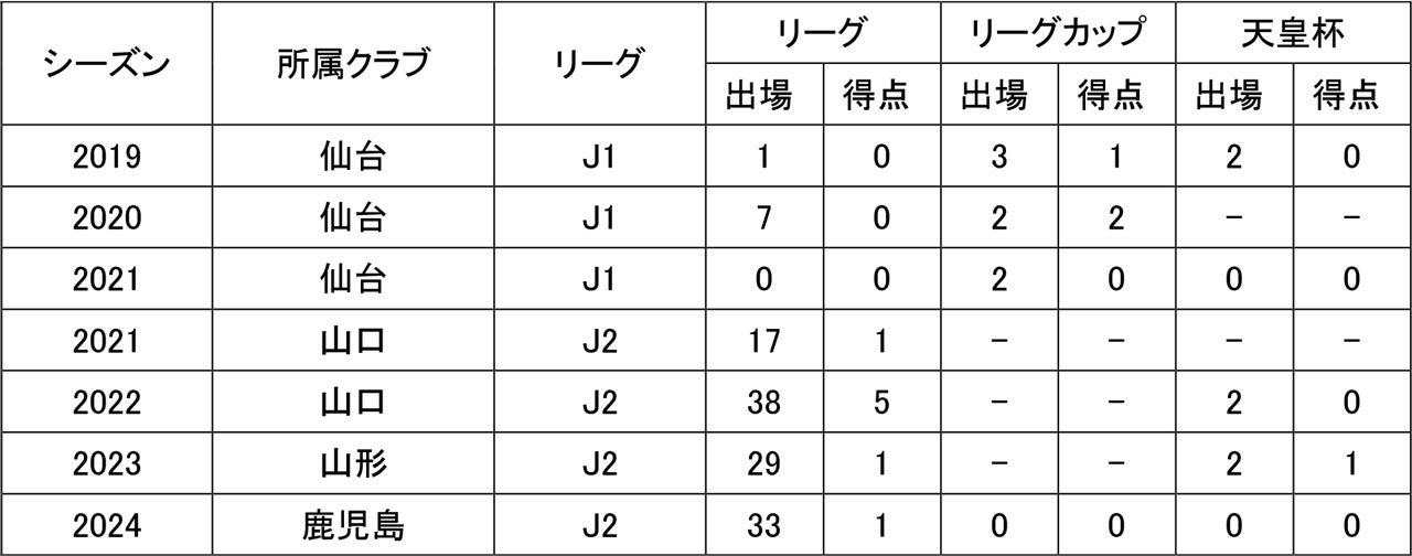 所属歴/FC尾島ジュニア – 前橋SCジュニアユース – 桐生第一高 – ベガルタ仙台 – レノファ山口FC – モンテディオ山形 – 鹿児島ユナイテッドFC