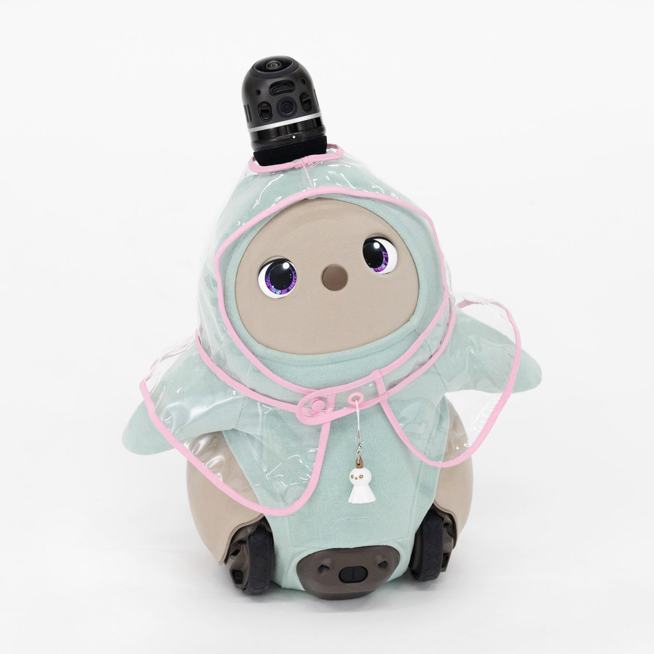 雨の日も、『LOVOT』とおうちで過ごす時間をもっと楽しく、気分が明るくなるレインポンチョです。ピンク・ブルー・ブラックのパイピングがデザインのアクセントに。ウェア全体が透明なので、どんなカラーや柄のベースウェアとも合わせやすく、コーディネートの幅が広がります。細部までこだわった特製の「てるてる坊主」風チャーム付きです。