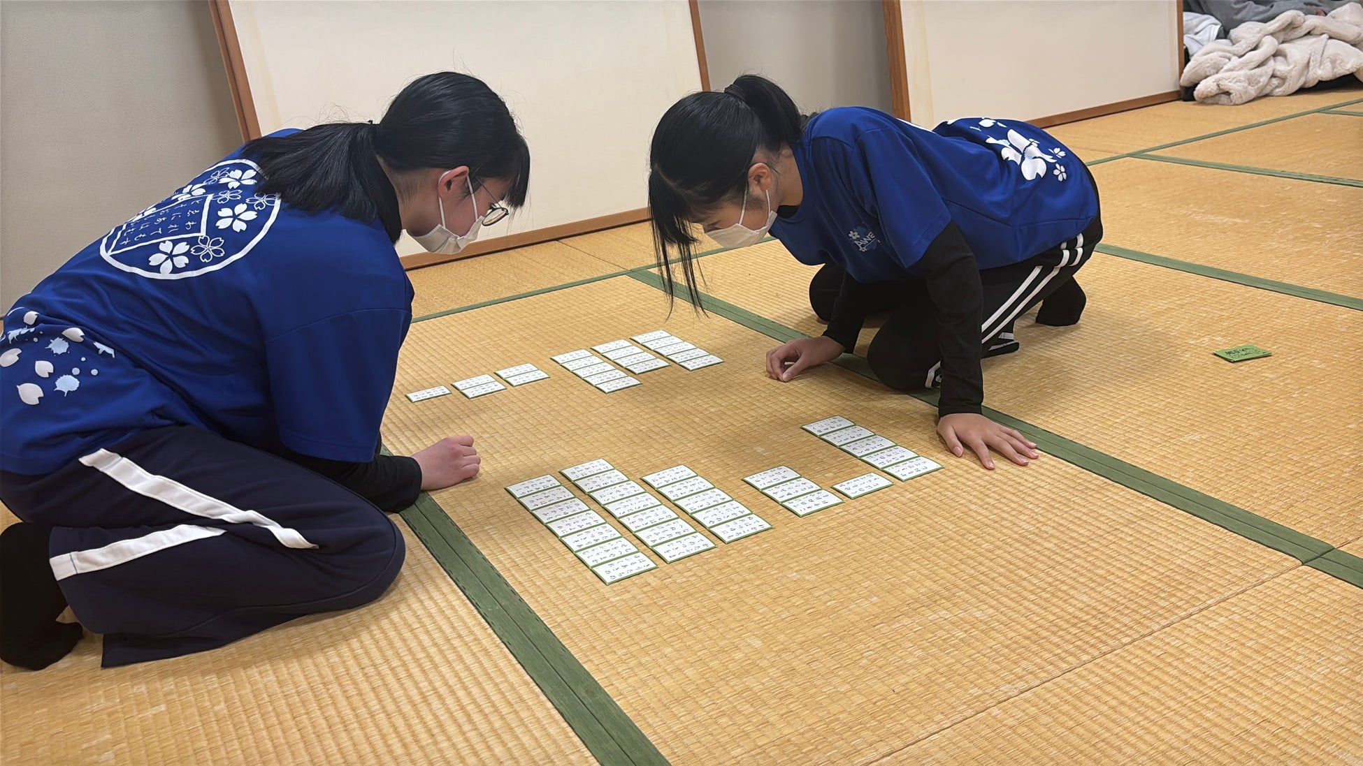 其々の相手と向き合った参加者たちは身動きを止めて集中。静かな緊張感が漂う中で決まり字が読まれると一斉に伸びた手は勢いよく札を払っていきます。