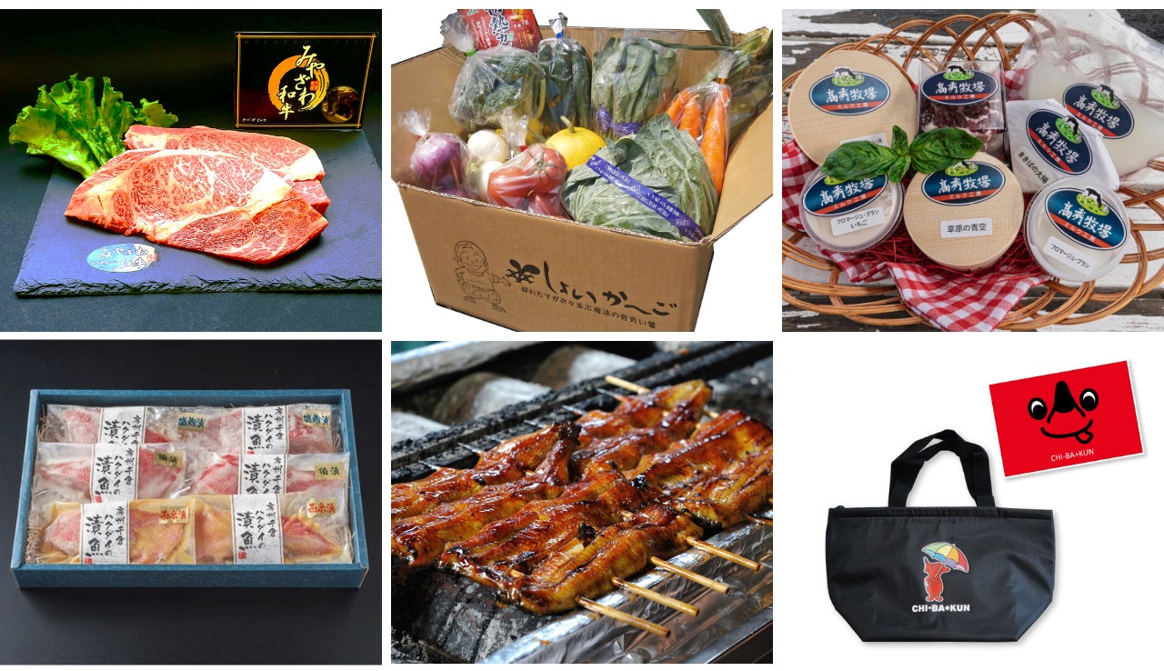 チバザビーフステーキ、千葉の絶品チーズ、金目鯛漬魚の詰合せ、旬の野菜ボックス&千葉のお米5kg、チーバくんグッズ、成田のうなぎ上蒲焼2人前