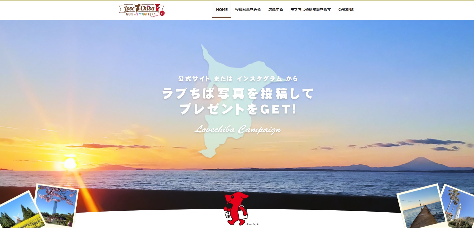 千葉県の魅力あふれる写真を投稿すると、毎月20名様にチーバくんグッズや千葉県の特産品が抽選で当たるキャンペーンです。