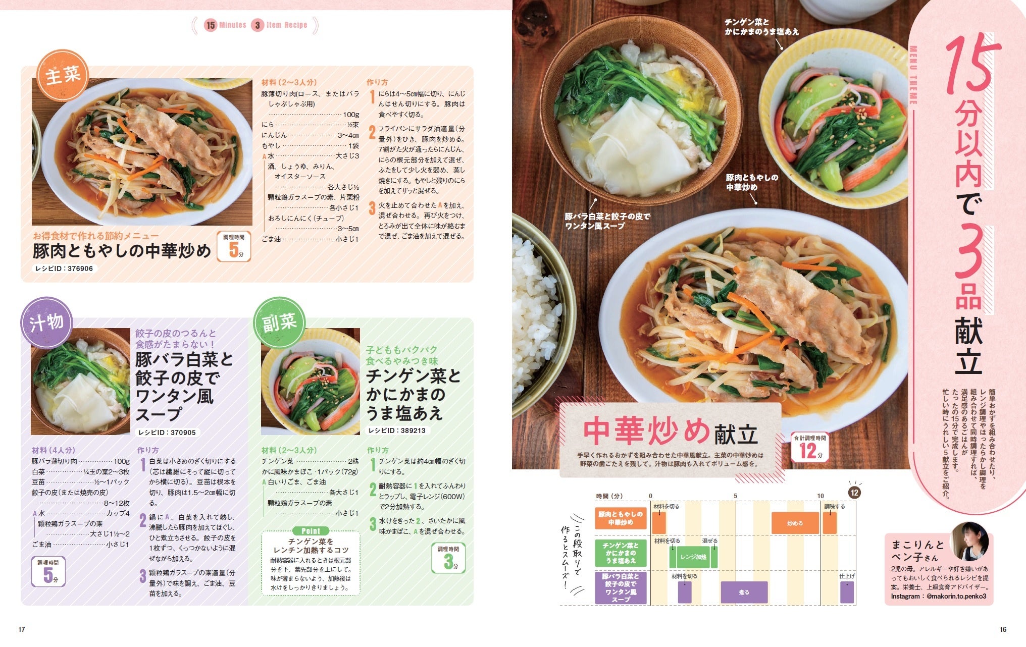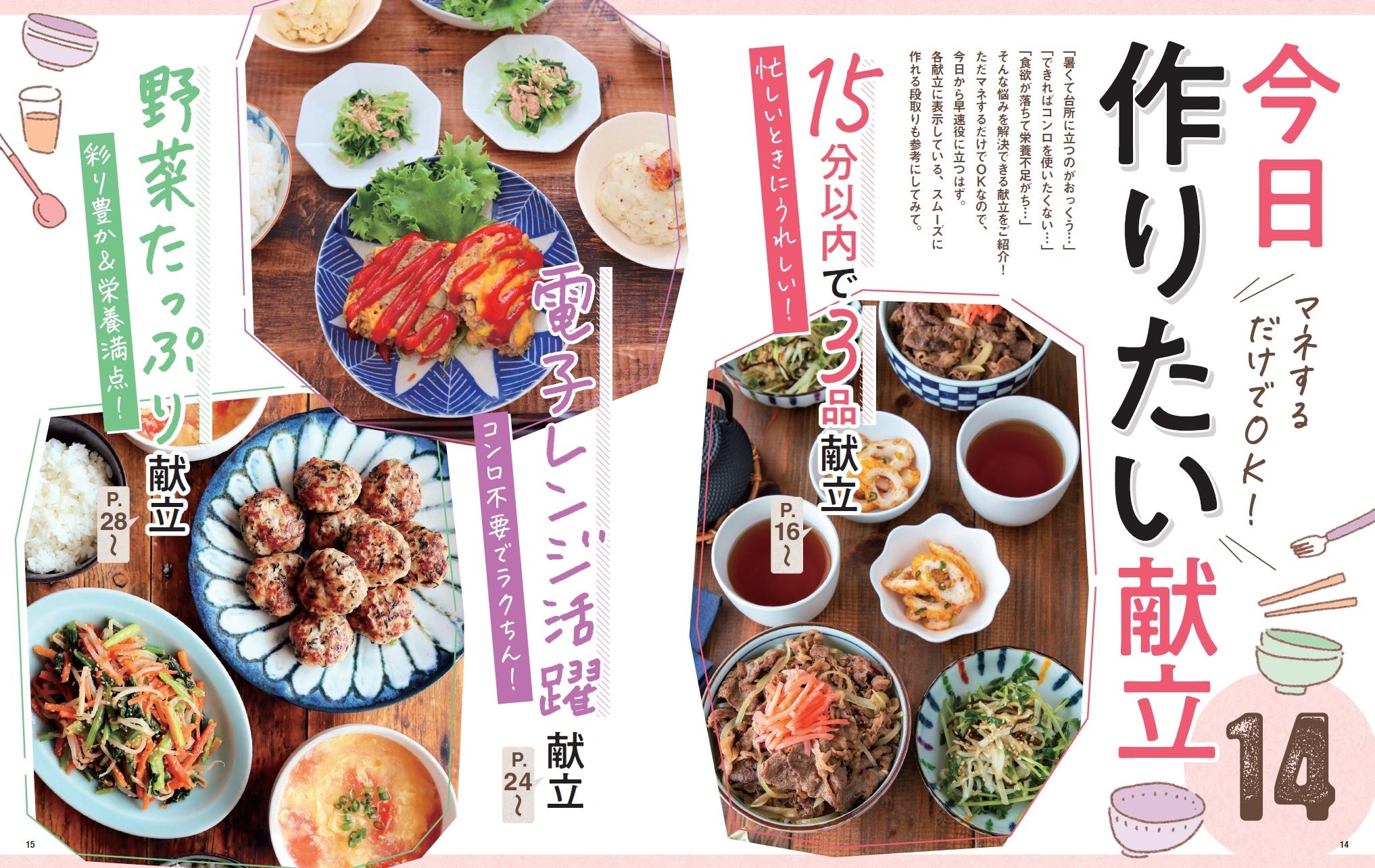 そこで「15分以内で3品できる献立」、「電子レンジ活躍献立」、「野菜たっぷり献立」を全14献立紹介します。献立づくりの悩みを一気に解消!